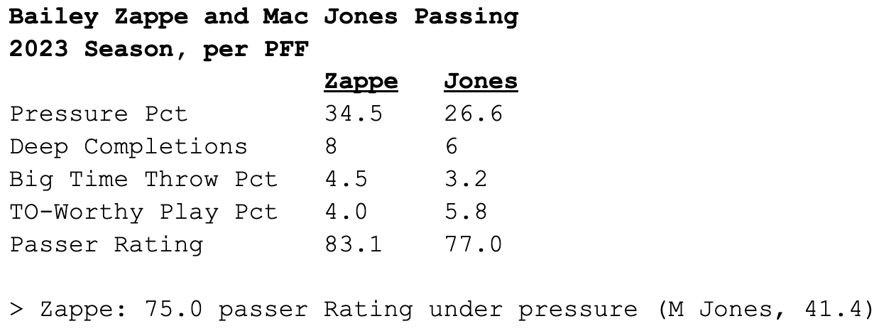 Constant big hits caused Mac Jones to shrink under pressure, while a lack of faith in his receivers led to more conservative. But Zappe’s fresh legs and perspective have allowed him to succeed despite an even higher pressure rate, and as he put it in Sunday’s postgame presser, “I like my guys better than anyone else.”