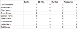 The Patriots’ offensive line mostly did its job by keeping Jones clean on 75.8 percent of his drop-backs with an average time to throw of 2.72 seconds.
