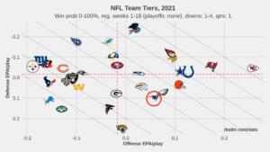 Over their last four games, three losses, the Pats were out-scored by a combined score of 38-7 in the first quarter. As the chart above shows, New England is one of the worst first-quarter defenses in the NFL this season (28th) compared to second in EPA per play in the final three quarters. Although it’s not as drastic, they also improve offensively later in games.
