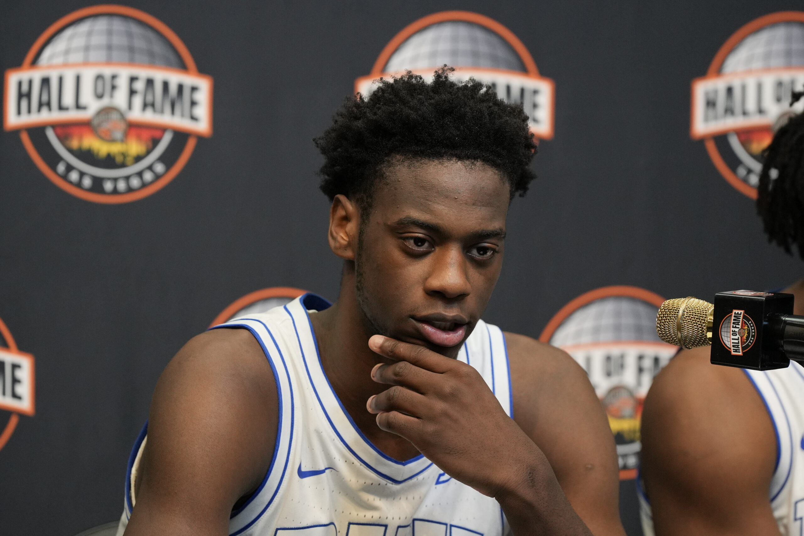 Nov 3, 2025; Las Vegas, Nevada, USA; BYU Cougars forward AJ Dybantsa (3) speaks during a press conference after the Hall of Fame Series game against the Villanova Wildcats at T-Mobile Arena. Mandatory Credit: Candice Ward-Imagn Images