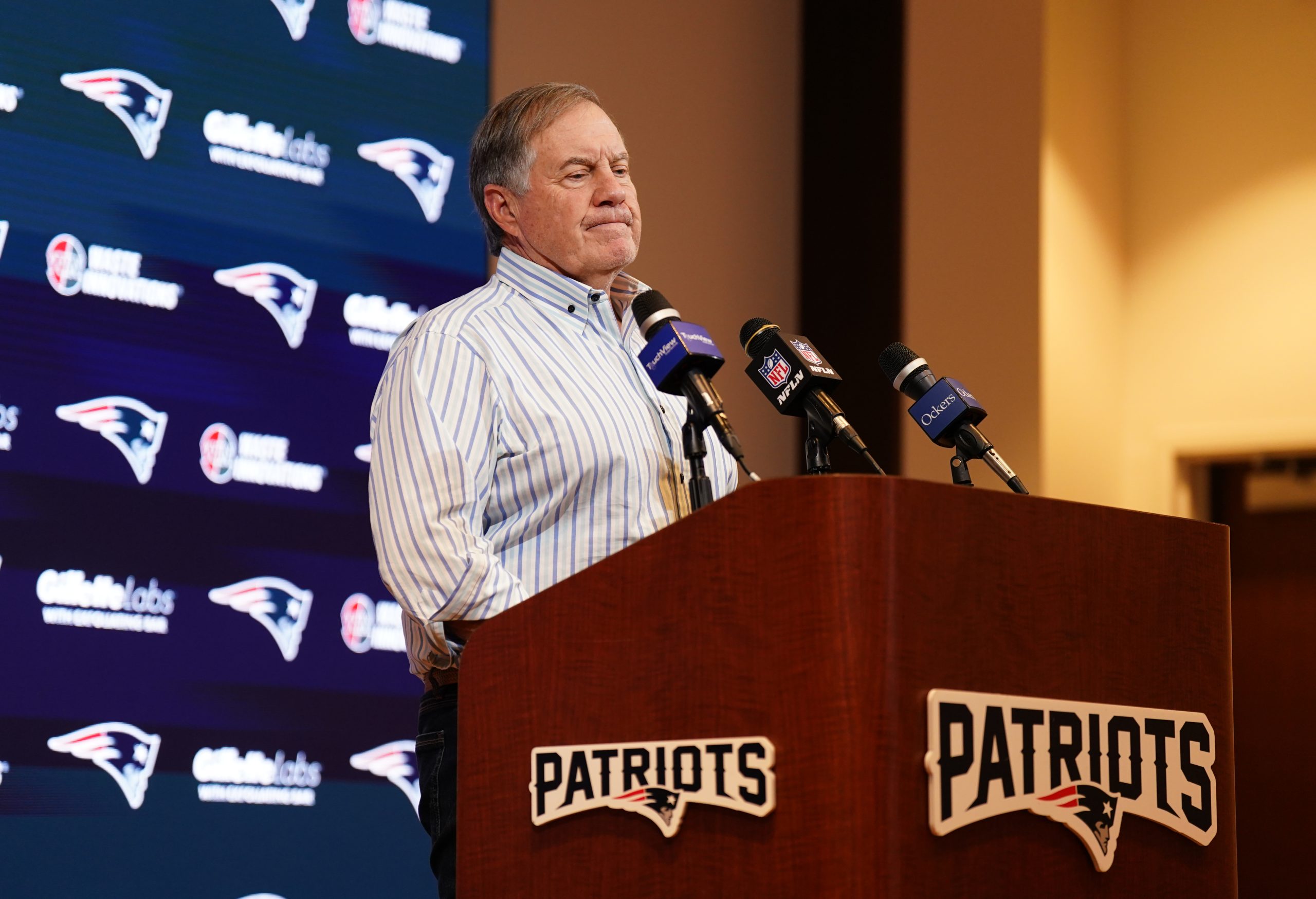 Jan 7, 2024; Foxborough, Massachusetts, USA; New England Patriots head coach Bill Belichick talks to reporters after the game against the New York Jets at Gillette Stadium. Mandatory Credit: David Butler II-USA TODAY Sports
