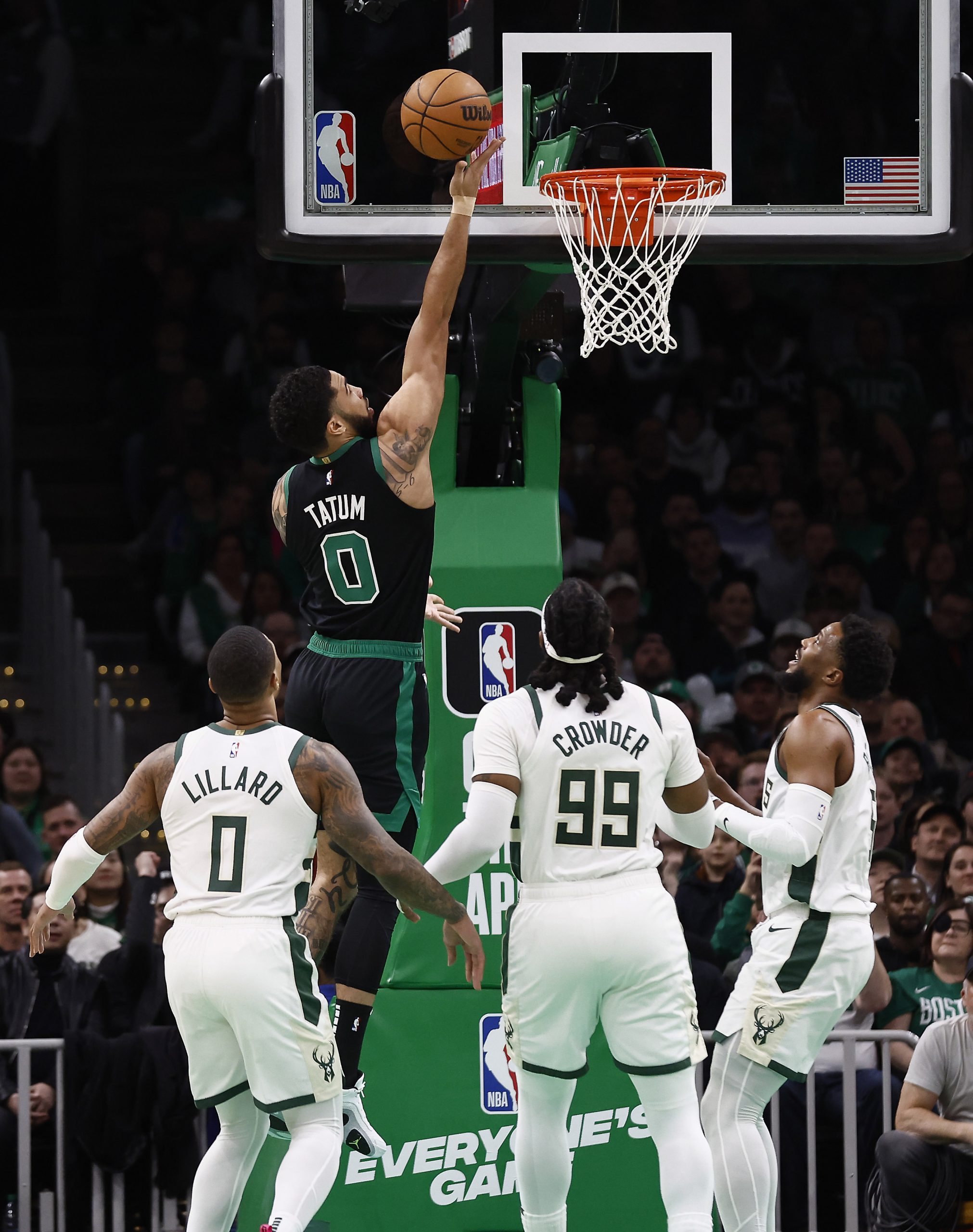 Mar 20, 2024; Boston, Massachusetts, USA; Boston Celtics forward Jayson Tatum (0) goes to the basket as Milwaukee Bucks guard Damian Lillard (0) and forward Jae Crowder (99) look on during the first quarter at TD Garden. Mandatory Credit: Winslow Townson-USA TODAY Sports