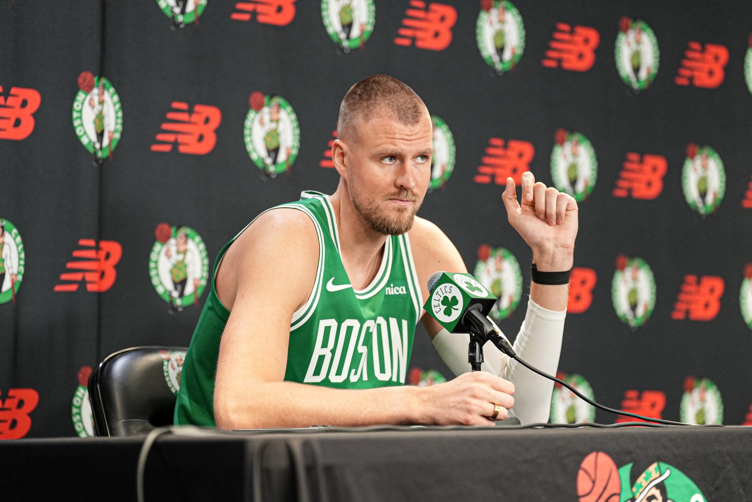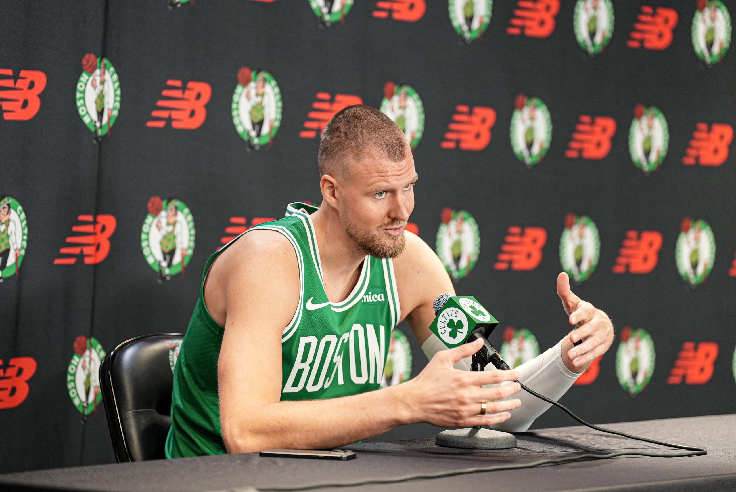 Kristaps Porzingis at Boston Celtics Media Day on September 24, 2024. (Photo by Rich LeMay, CLNS).