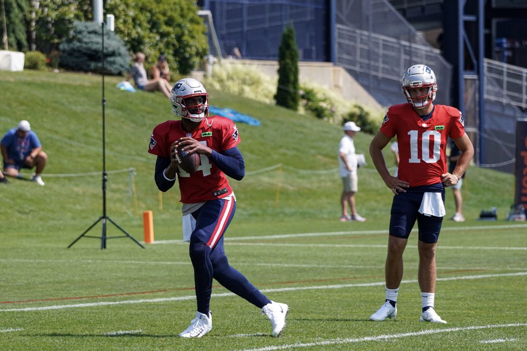 Jacoby Brissett and Drake Maye at Day 10 of Patriots Training Camp on August 5th, 2024. Photo by Rich LeMay (CLNS Media).