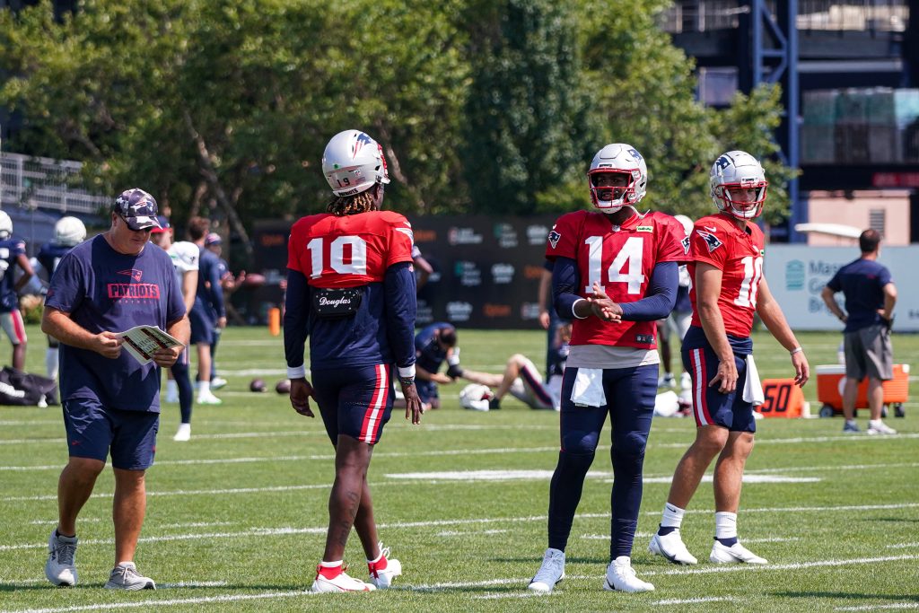 Jacoby Brissett, Joe Milton and Drake Maye at Day 10 of Patriots Training Camp on August 5th, 2024. Photo by Rich LeMay (CLNS Media).