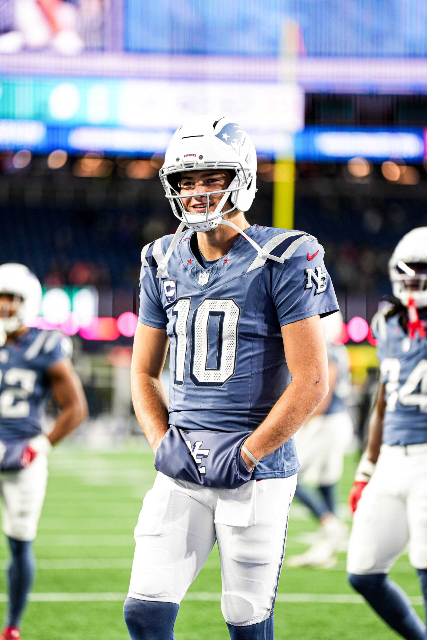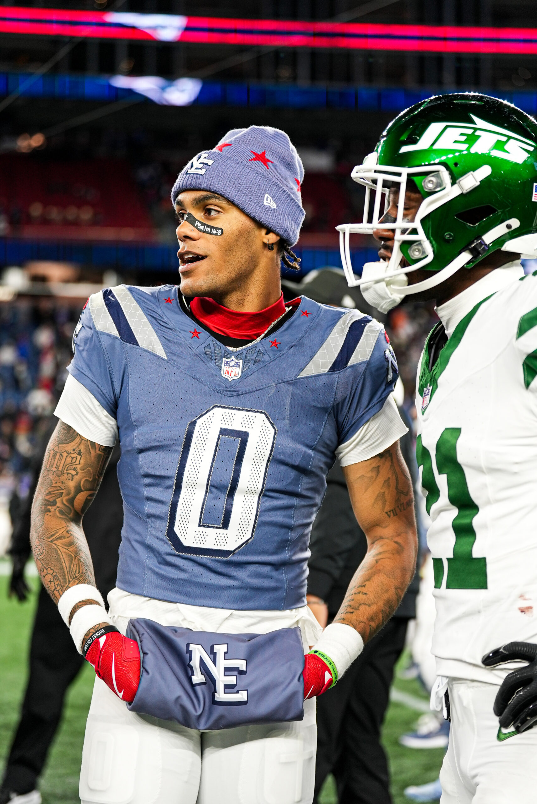 Drake Maye and DeMario Douglas at Patriots Jets Week 11. Photo by CLNS Media.