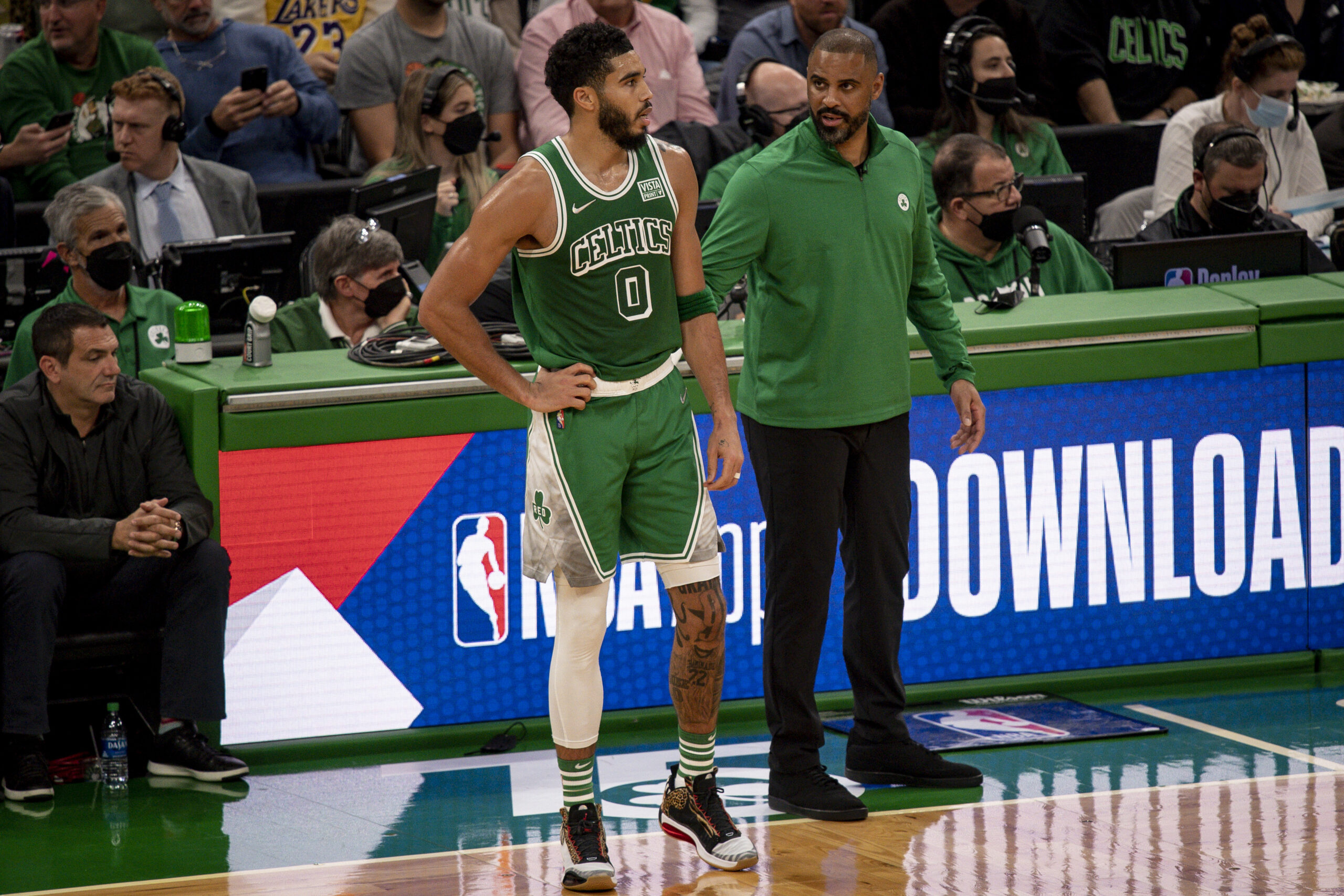 BOSTON, MASSACHUSETTS - NOVEMBER 19: Jayson Tatum #0 of the Boston Celtics talks with head coach Ime Udoka of the Boston Celtics during the fourth quarter against the Los Angeles Lakers at TD Garden November 19, 2021 in Boston, Massachusetts. NOTE TO USER: User expressly acknowledges and agrees that, by downloading and or using this photograph, User is consenting to the terms and conditions of the Getty Images License Agreement. (Photo by Maddie Malhotra/Getty Images)