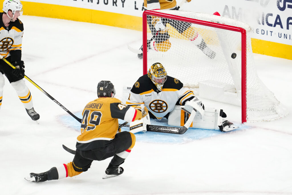 - Zadorov Penalty: Boston’s Nikita Zadorov took a slashing penalty 8:15 into the second period which led to the Knights first goal. The penalty was Zadorov’s 35th minor of the season, second most in the NHL.