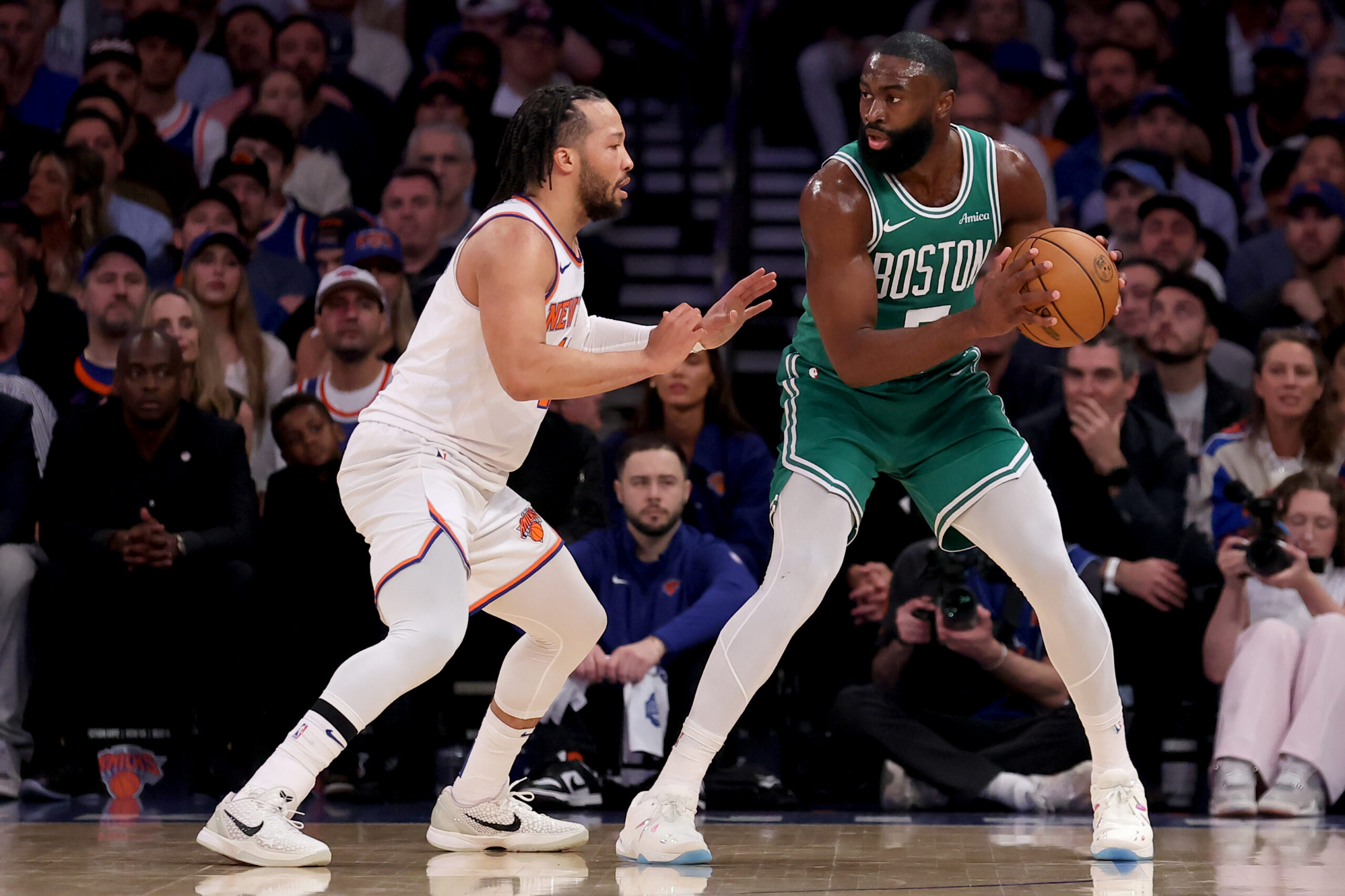 May 16, 2025; New York, New York, USA; Boston Celtics guard Jaylen Brown (7) controls the ball against New York Knicks guard Jalen Brunson (11) during the first quarter of game six in the second round of the 2025 NBA Playoffs at Madison Square Garden. Mandatory Credit: Brad Penner-Imagn Images