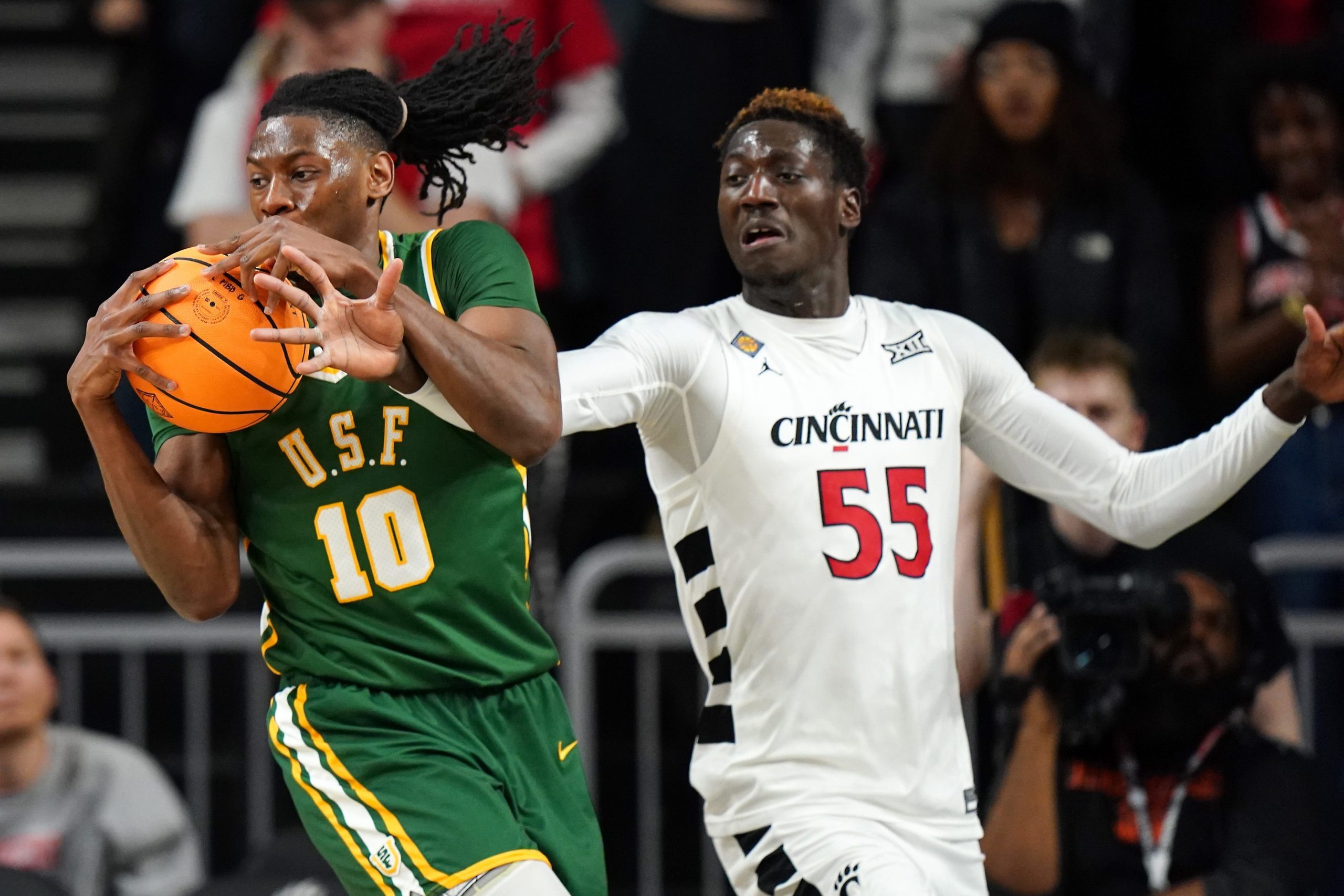 San Francisco Dons forward Jonathan Mogbo (10) maintains possession from Cincinnati Bearcats forward Aziz Bandaogo (55) in overtime of a college basketball game in the National Invitation Tournament, Wednesday, March 20, 2024, at Fifth Third Arena in Cincinnati.