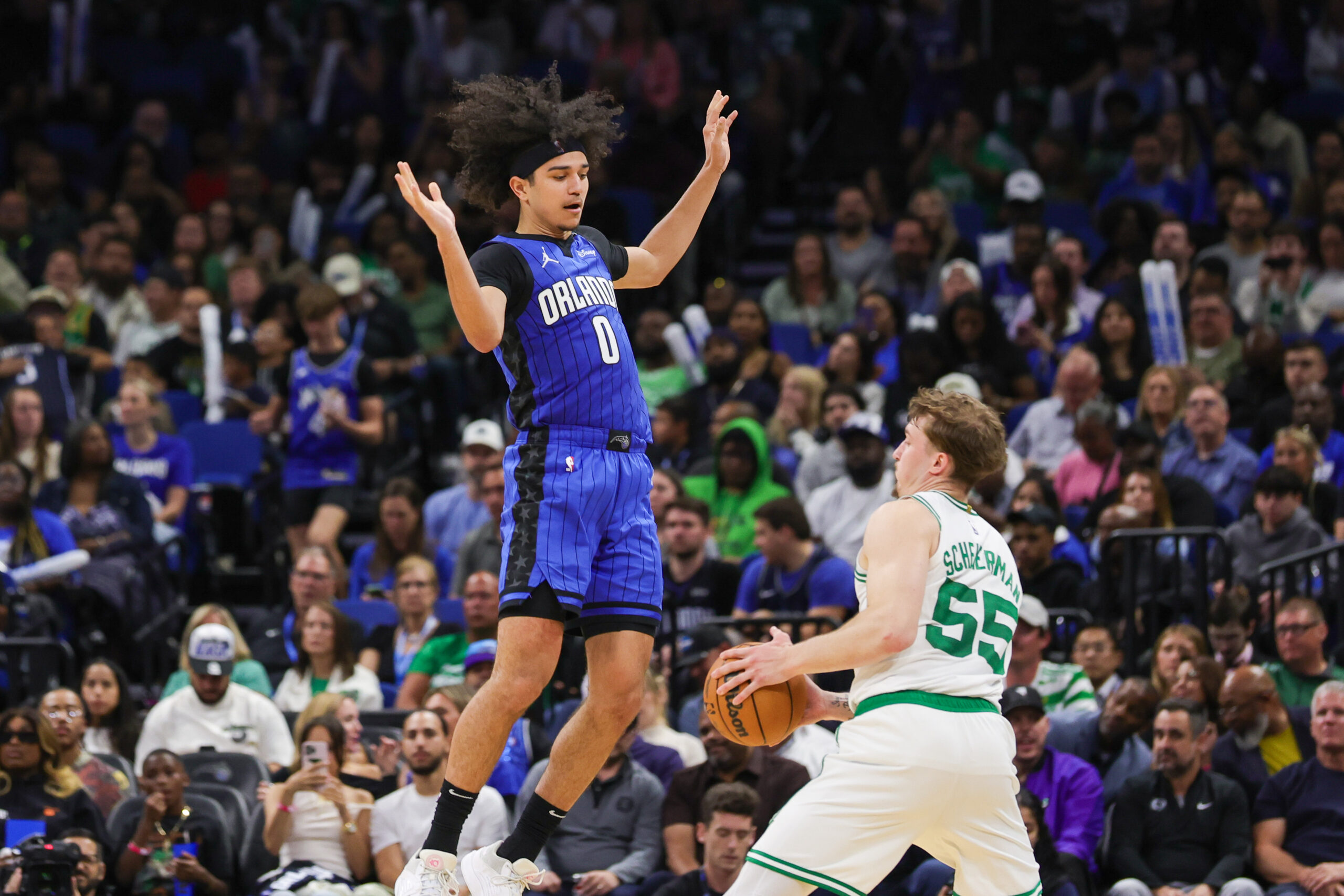 Apr 9, 2025; Orlando, Florida, USA; Orlando Magic guard Anthony Black (0) defends Boston Celtics forward Baylor Scheierman (55) during the second half at Kia Center. Mandatory Credit: Mike Watters-Imagn Images