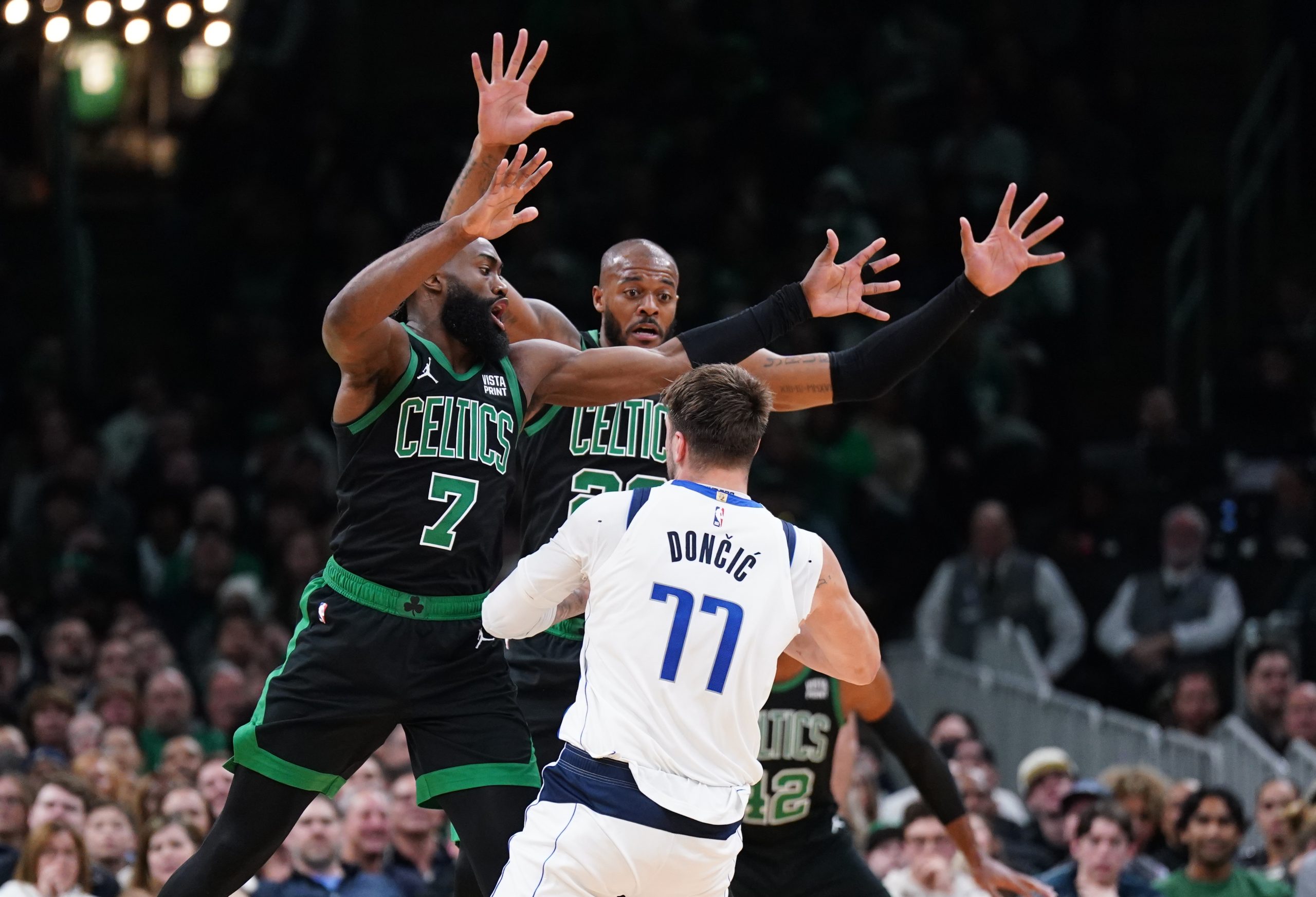 Mar 1, 2024; Boston, Massachusetts, USA; Boston Celtics guard Jaylen Brown (7) and forward Xavier Tillman (26) defend against Dallas Mavericks guard Luka Doncic (77) in the second half at TD Garden. Mandatory Credit: David Butler II-USA TODAY Sports