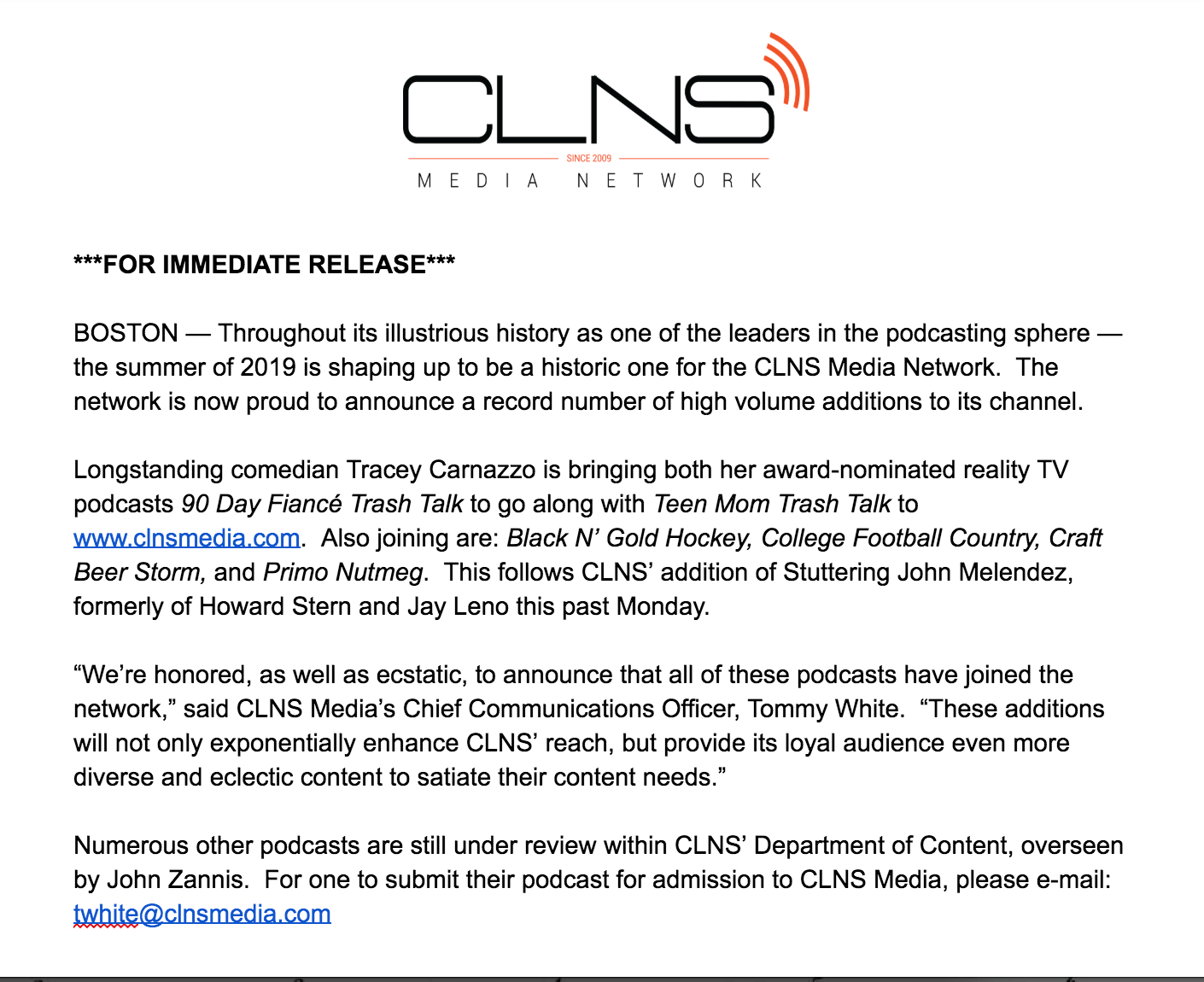 Longstanding comedian Tracey Carnazzo is bringing both her award-nominated reality TV podcasts 90 Day Fiancé Trash Talk to go along with Teen Mom Trash Talk to www.clnsmedia.com. Also joining are: Black N’ Gold Hockey, College Football Country, Craft Beer Storm, and Primo Nutmeg. This follows CLNS’ addition of Stuttering John Melendez, formerly of Howard Stern and Jay Leno this past Monday.