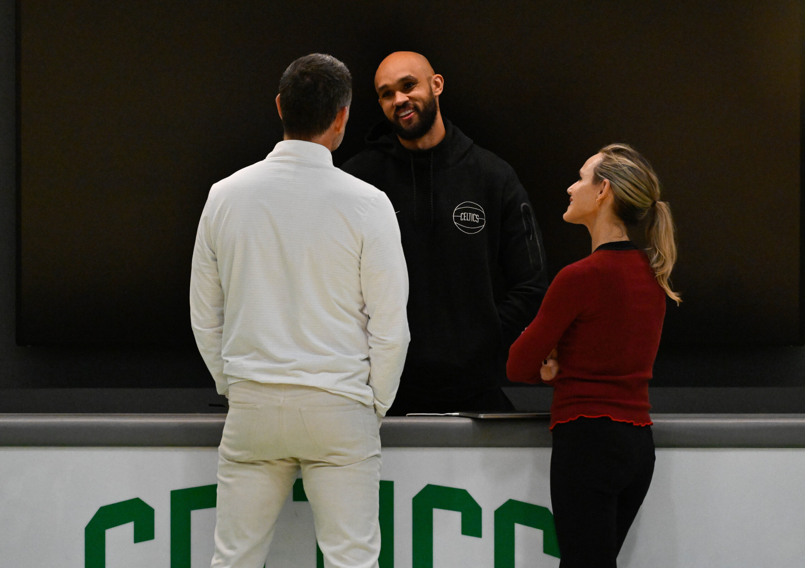 Sep 25, 2025; Boston, MA, USA; Boston Celtics lead owner and governor Bill Chisholm and his wife Kimberly talk to guard Derrick White after a press conference at the Auerbach Center. Mandatory Credit: Eric Canha-Imagn Images