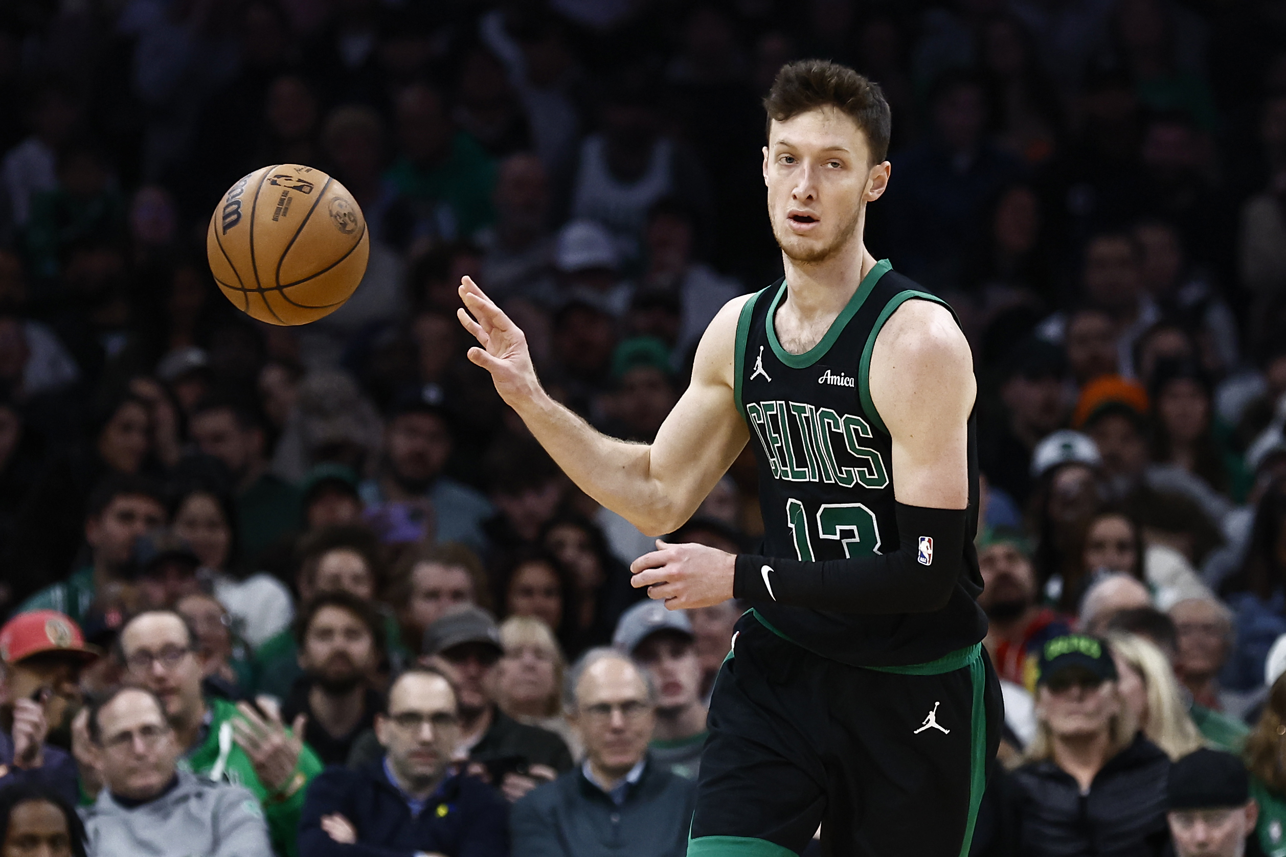 Dec 2, 2024; Boston, Massachusetts, USA; Boston Celtics forward Drew Peterson (13) dishes the ball off during the second half against the Miami Heat at TD Garden. Mandatory Credit: Winslow Townson-Imagn Images