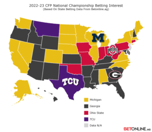 Below is an InfoMap, from BetOnline, outlining who the betting public in each state is placing their money to win the College Football Playoff National Championship: