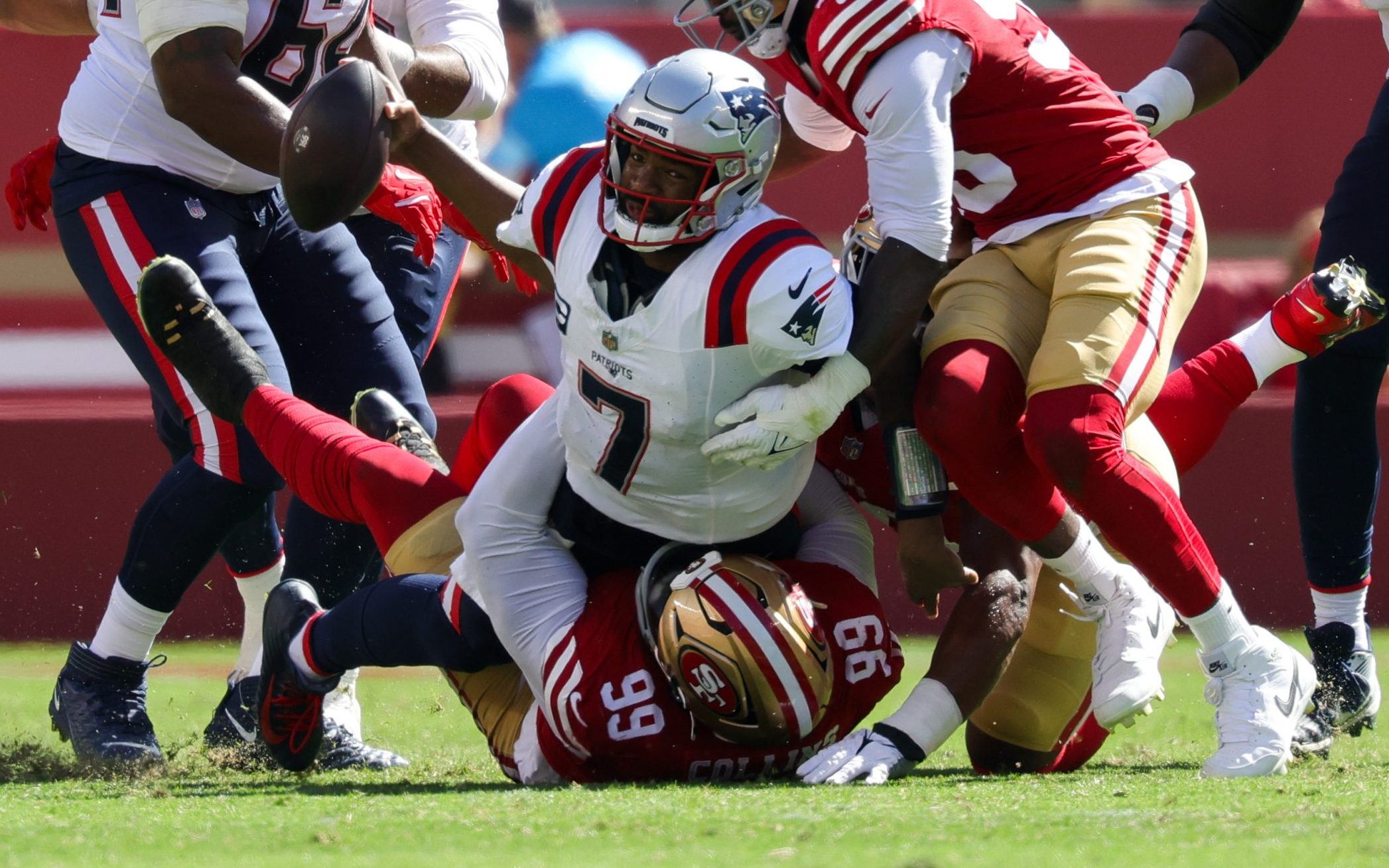 The Patriots’ patchwork line ranked dead last in pressure rate allowed (44.8%) entering Week 4, and things only got worse against Nick Bosa and company.