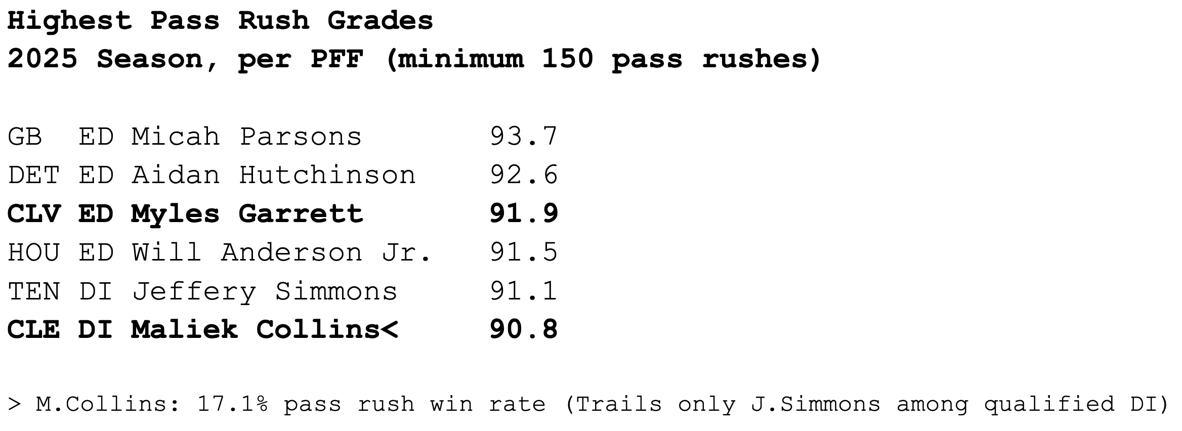 Myles Garrett is obviously a world-beater, but Maliek Collins (#96) is having a career year at 30, and you can't sleep on Mason Graham (#94) or the Browns' other edge rushers
