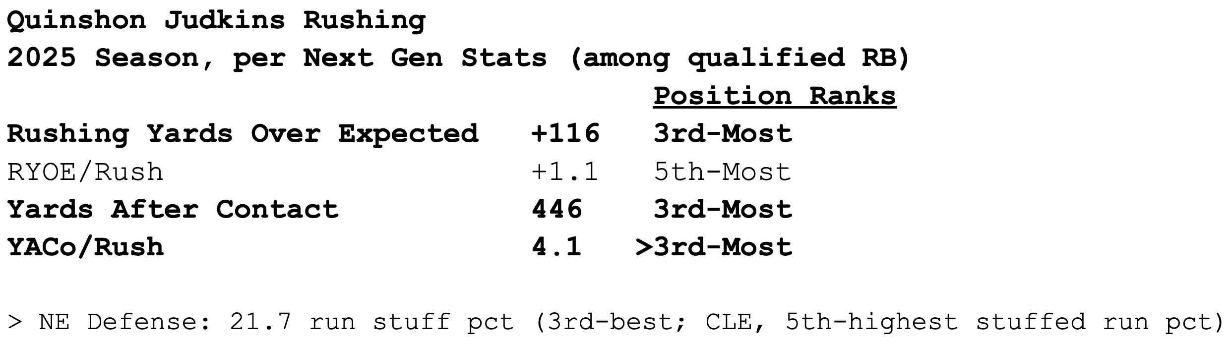 According to Next Gen Stats, the Browns are the only team in the league averaging negative yards before contact on the ground (-0.03). Despite those struggles, Judkins ranks 11th in rushing yards (467) and is tied for the 5th-most rushing touchdowns (5), thanks largely to his excellence after contact.