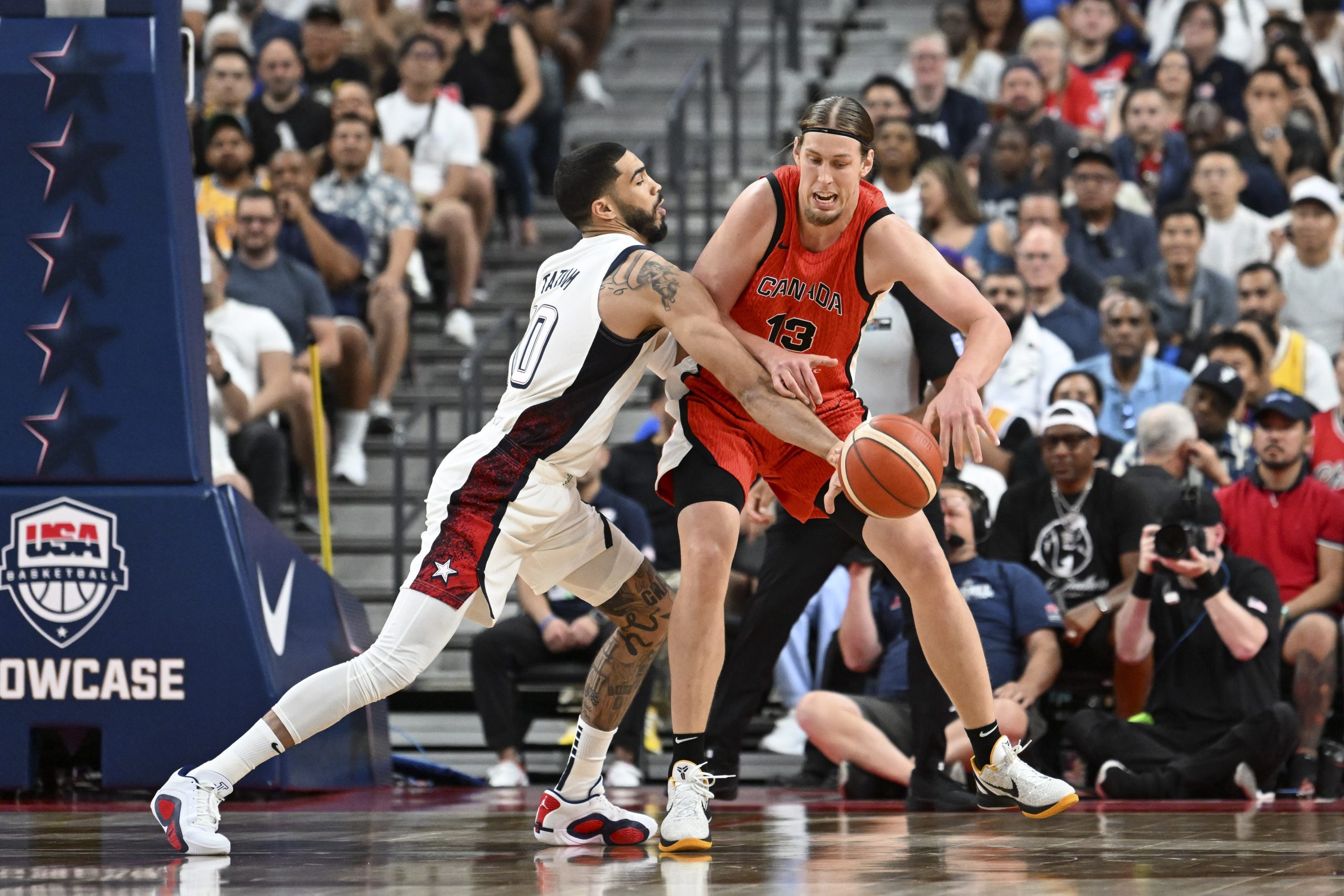 Jul 10, 2024; Las Vegas, Nevada, USA; USA forward Jayson Tatum (10) knocks the ball away from Canada forward Kelly Olynyk (13) in the first quarter during the USA Basketball Showcase at T-Mobile Arena. Mandatory Credit: Candice Ward-USA TODAY Sports
