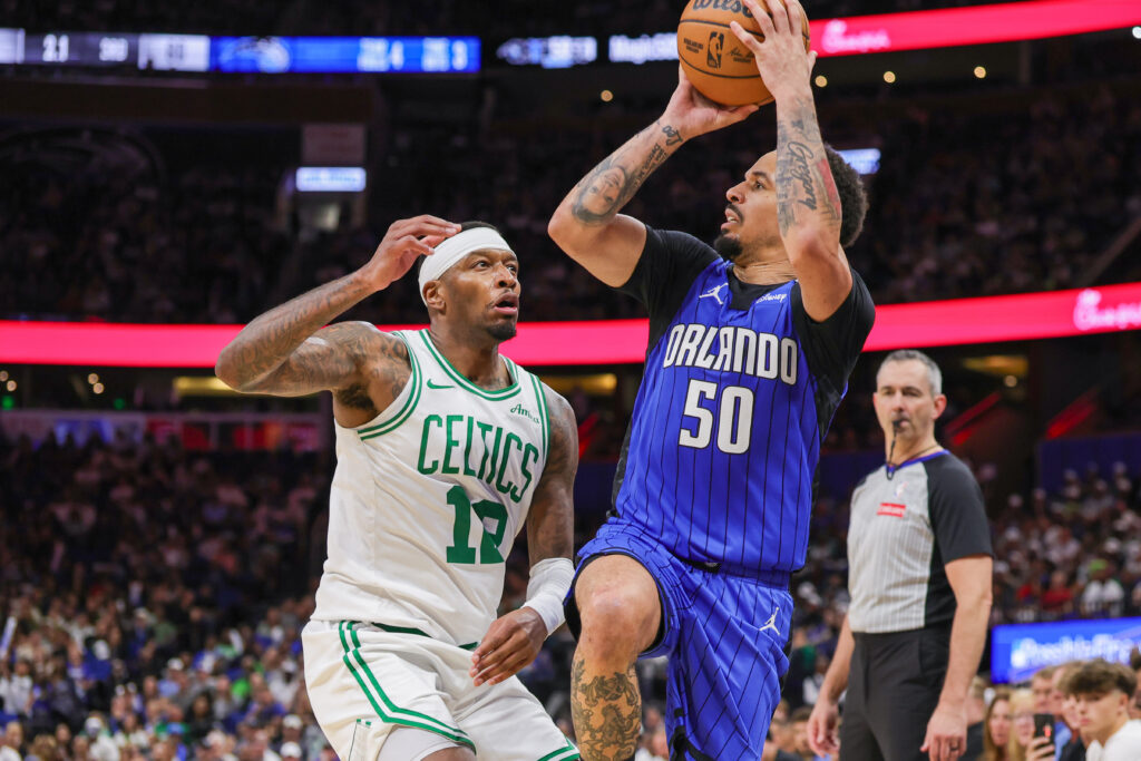 Apr 9, 2025; Orlando, Florida, USA; Orlando Magic guard Cole Anthony (50) shoots over Boston Celtics forward Torrey Craig (12) during the second half at Kia Center. Mandatory Credit: Mike Watters-Imagn Images