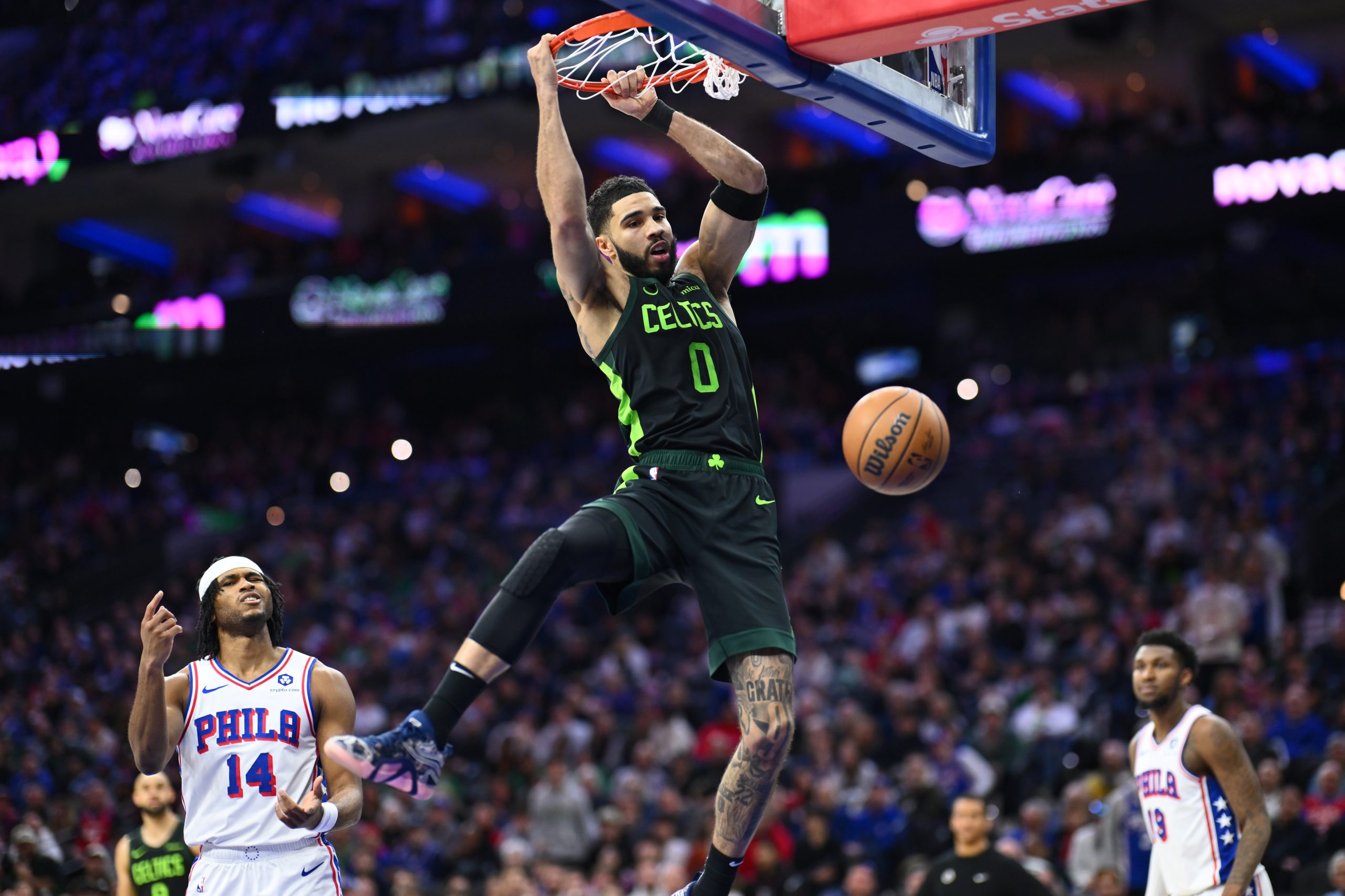 Feb 2, 2025; Philadelphia, Pennsylvania, USA; Boston Celtics forward Jayson Tatum (0) dunks against the Philadelphia 76ers in the second quarter at Wells Fargo Center. Mandatory Credit: Kyle Ross-Imagn Images