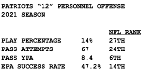 According to Sharp Football Analytics, the Patriots ranked 27th in using 12 personnel (2 WR, 2 TE, 1 RB), the personnel grouping many expected them to live in during the 2021 season.