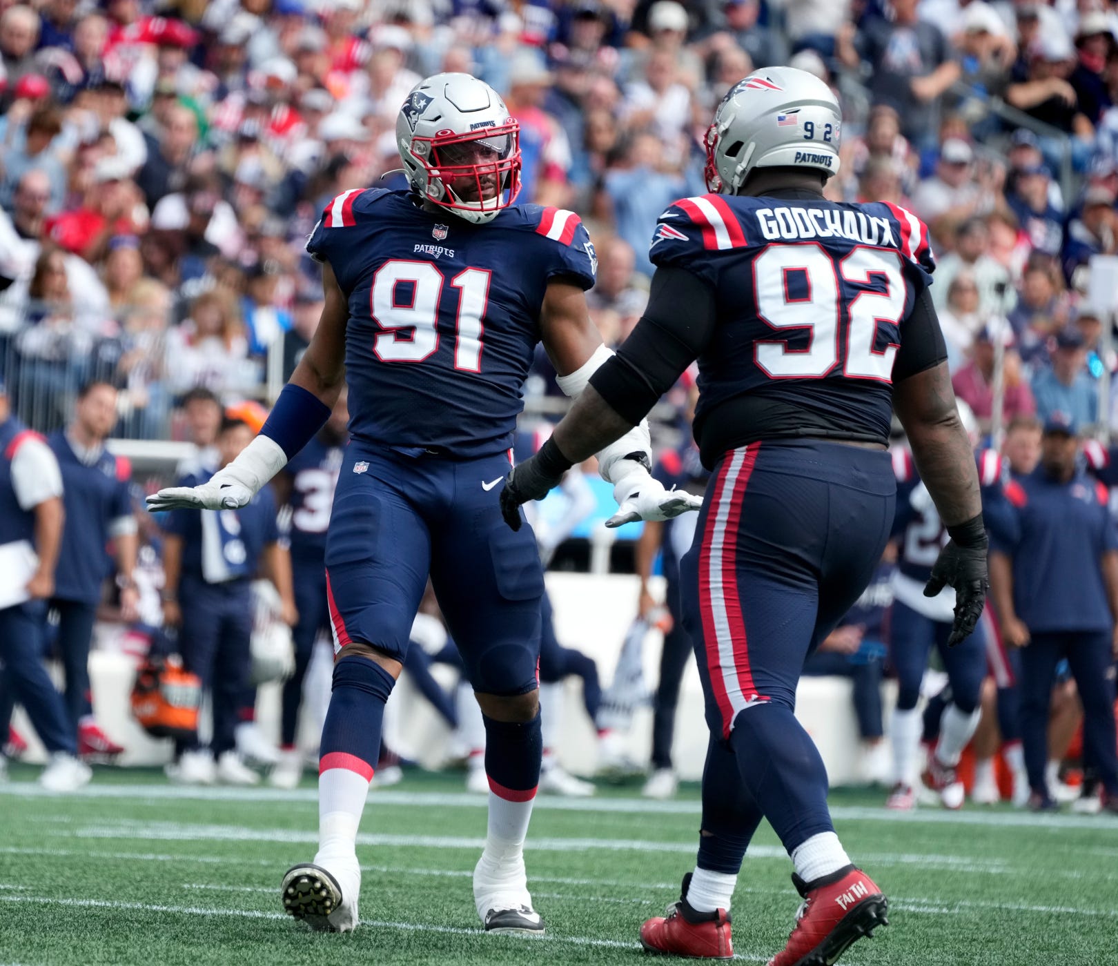 Deatrich Wise Jr. celebrates a 2nd quarter sack with Davon Godchaux. Patriots home opener against the Baltimore Ravens on Sept 25, 2022. [The Providence Journal / Kris Craig]