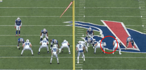 Here, the Jags fall into cover-two with a safety dropping at the snap. With Buffalo running skinny posts in a three verticals concept, it forces Allen to make an anticipatory throw to Emmanuel Sanders by leading him into the open void between the zone-droppers, and it’s an errant pass.