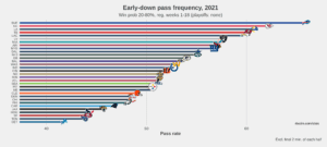 Starting with the Pats defense against the Bills’ explosive passing offense, Buffalo under Daboll is the most aggressive early-down passing team in the NFL by an extremely wide margin.