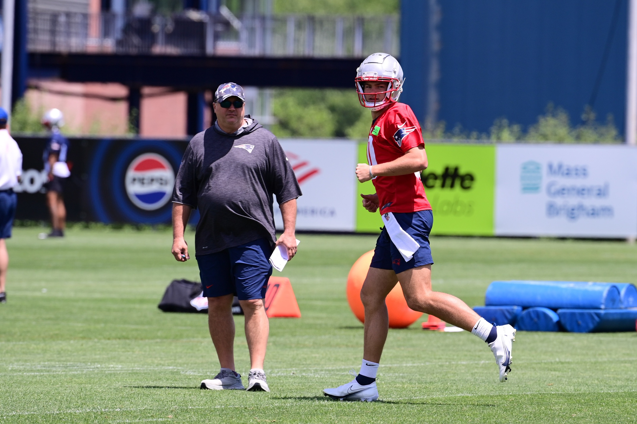 Jun 10, 2024; Foxborough, MA, USA; New England Patriots quarterback Drake Maye (10) works out as offensive coordinator Alex Van Pelt watches at minicamp at Gillette Stadium. Mandatory Credit: Eric Canha-USA TODAY Sports