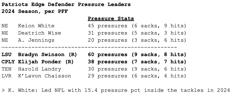 After focusing heavily on offense to begin their draft, the Patriots somehow landed LSU’s Bradyn Swinson in the 5th round, then signed Cal Poly standout Elijah Ponder as a priority free agent.