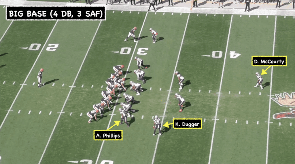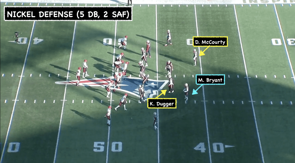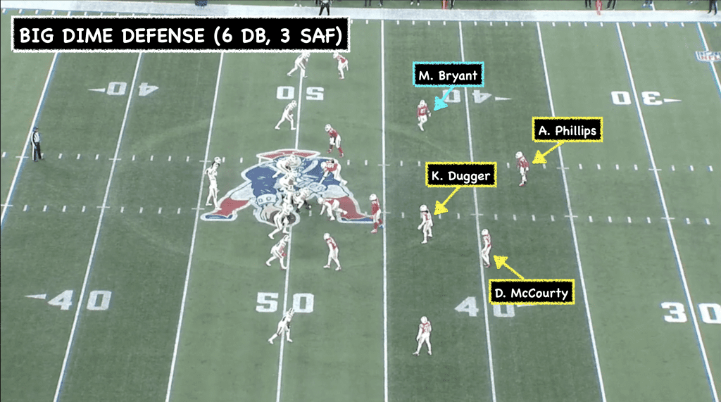 Just before the snap, Dugger would bump out and essentially become a power slot. Bryant responded by dropping to become a split-field safety with Bentley shifting inside to beef up the interior.