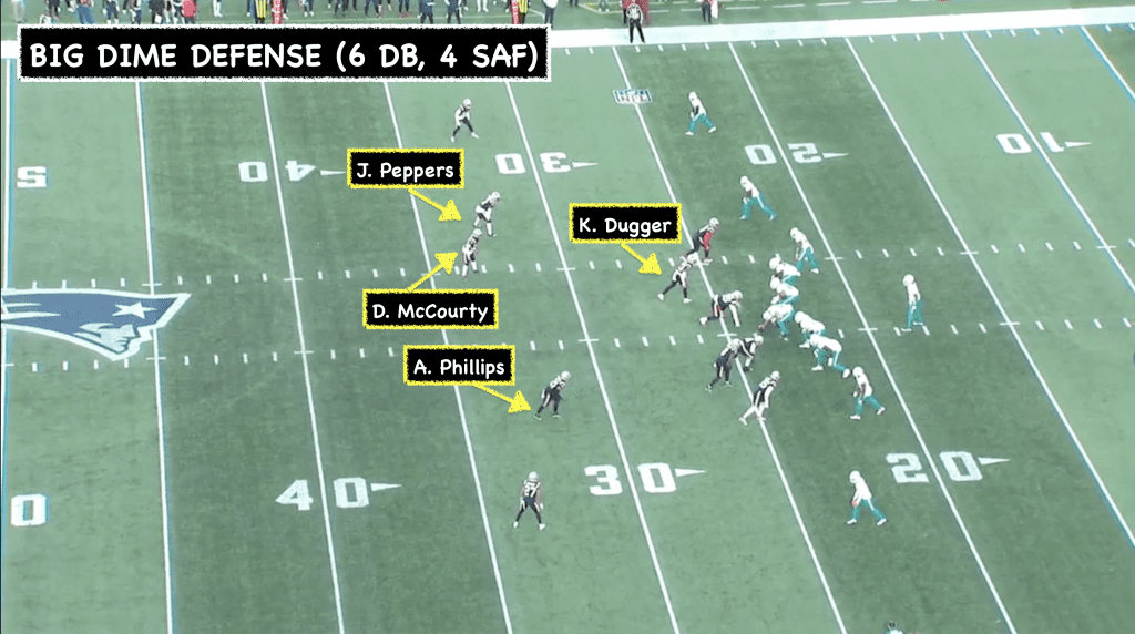 The Patriots like to field as many defensive backs as possible in obvious pass situations, when they tend to play a heavy dose of man coverage. Consequently, no team played more dime (six defensive backs) than New England last season, with the team specializing in big dime featuring as many as four safeties. Dugger typically played linebacker from these looks with McCourty and another safety, usually Adrian Phillips, on the backend.
