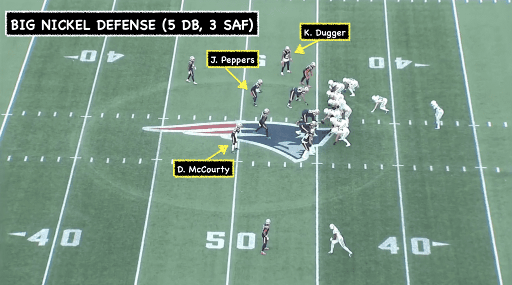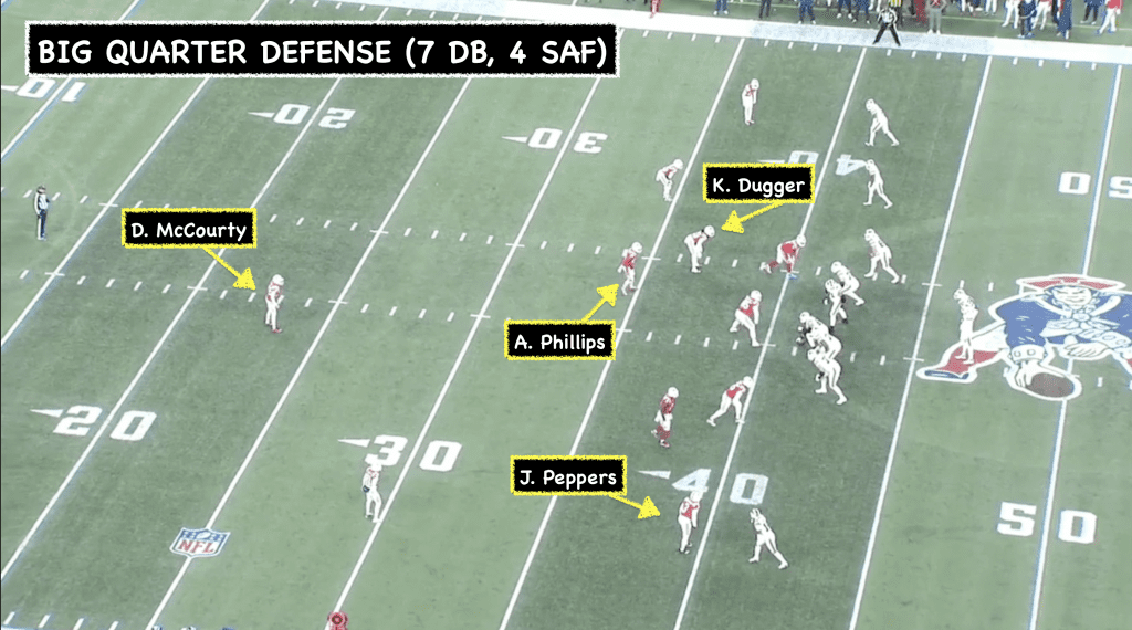 In 3rd & 10+ situations and two-minute drives, the Patriots sometimes deployed their quarter defense featuring a whopping seven defensive backs with four safeties. One of the more interesting uses of this package saw Peppers act as a “cloud” corner outside the numbers, jamming receivers before passing them off to a corner playing deep zone.