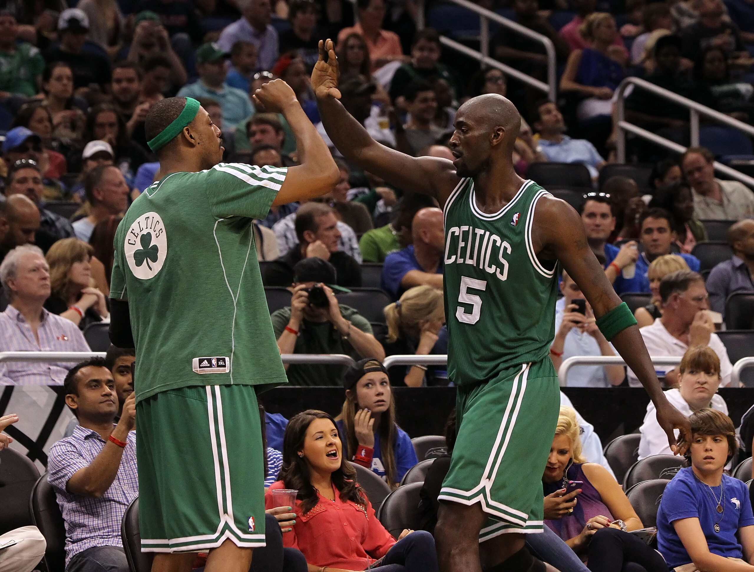 Apr 13, 2013; Orlando, FL, USA; Boston Celtics small forward Paul Pierce (34) and center Kevin Garnett (5) congratulate each other during the second half against the Orlando Magic at the Amway Center. Boston Celtics won 120-88. Mandatory Credit: Kim Klement-USA TODAY Sports