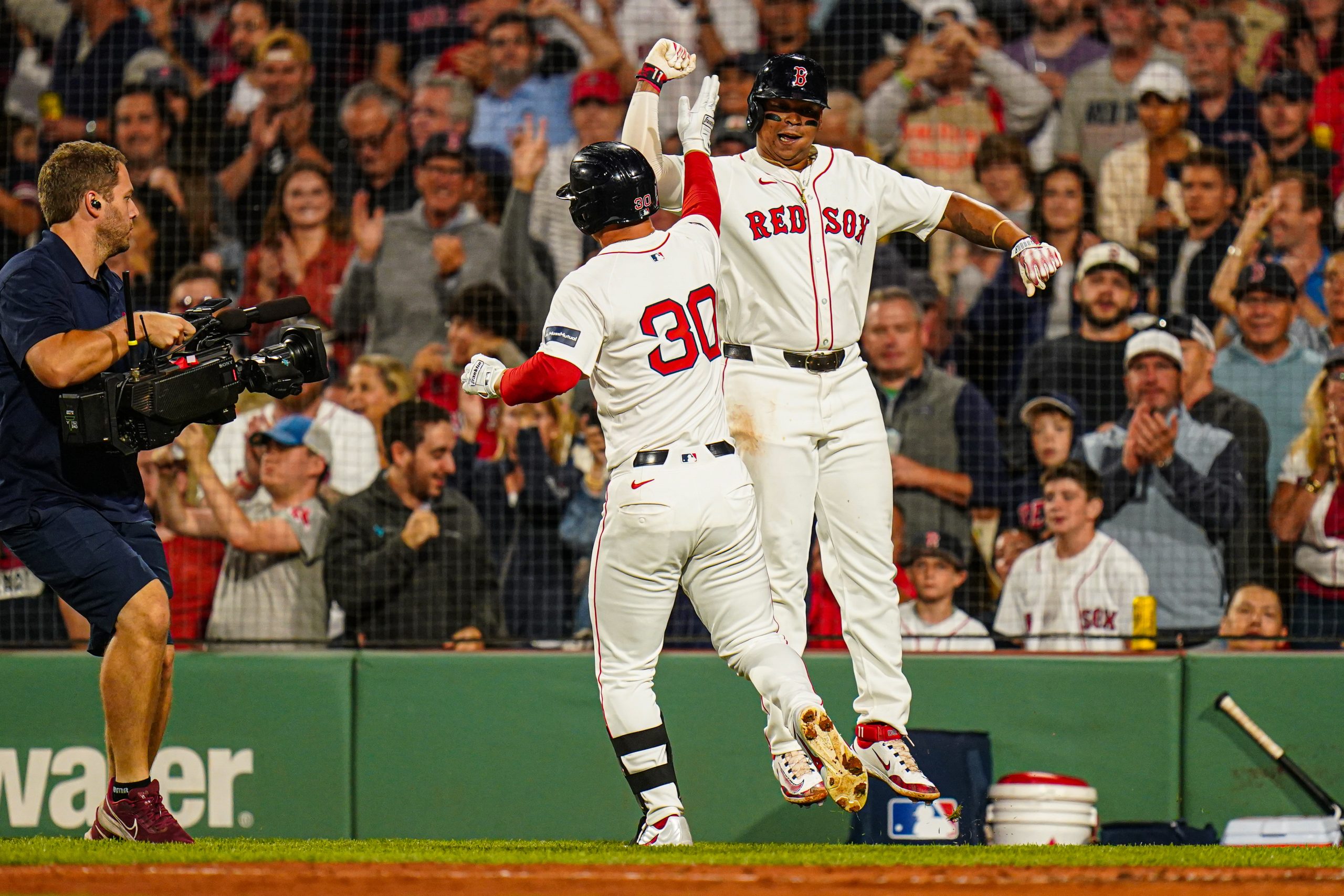Sep 9, 2024; Boston, Massachusetts, USA; Boston Red Sox right fielder Rob Refsnyder (30) is congratulated by third baseman Rafael Devers (11) after hitting a two run home run against the Baltimore Orioles in the third inning at Fenway Park. Mandatory Credit: David Butler II-Imagn Images