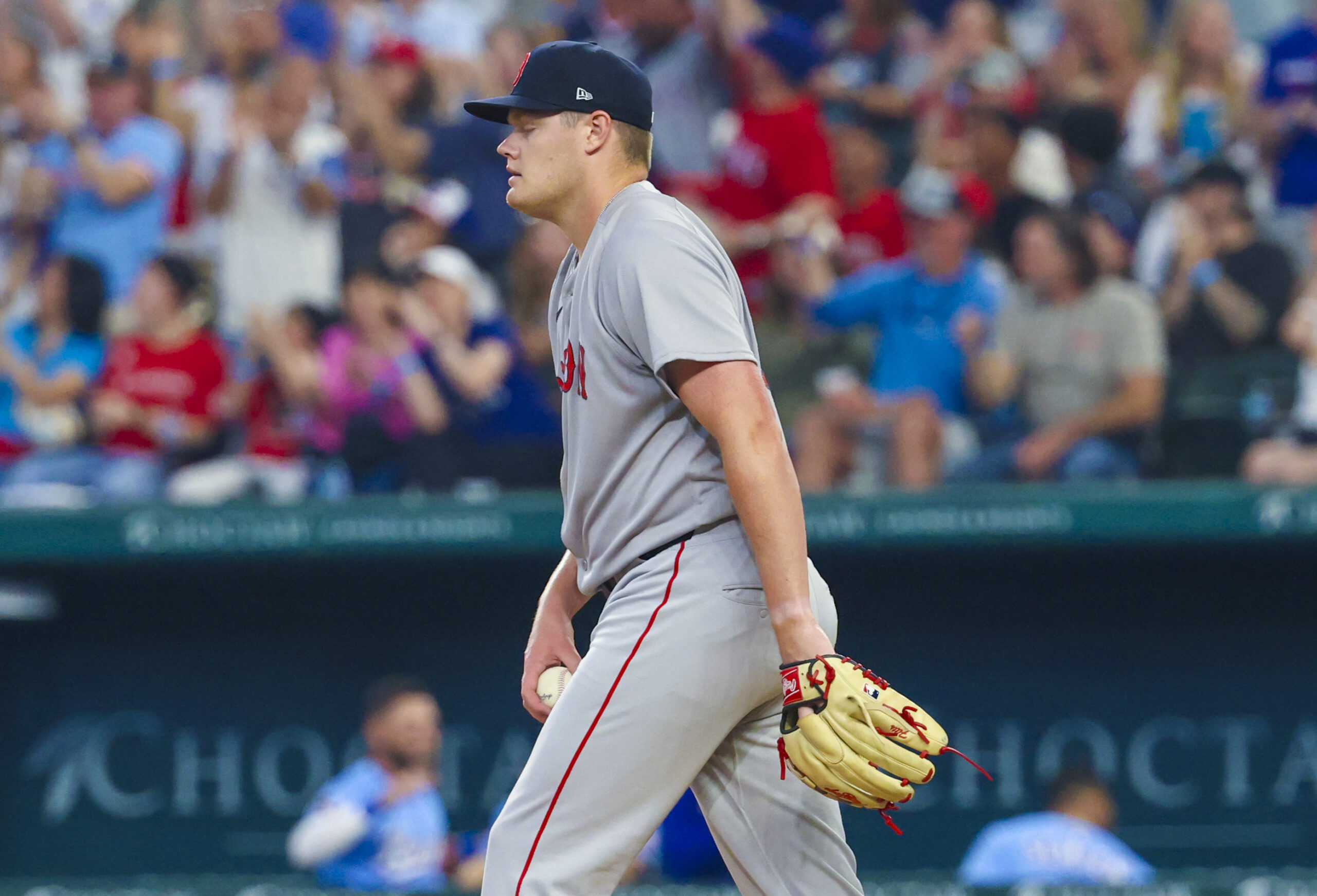 Mar 30, 2025; Arlington, Texas, USA; Boston Red Sox starting pitcher Richard Fitts (80) reacts after giving up a home run to Texas Rangers right fielder Adolis Garcia (not pictured) during the sixth inning at Globe Life Field. Mandatory Credit: Kevin Jairaj-Imagn Images