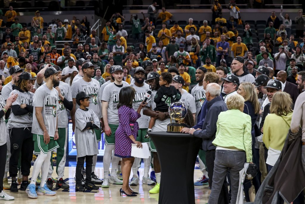 Tatum, who delivered the final commentary on the win, breathed in the moment longer, remaining on the floor with White after taking photos with a group of friends that included assistant and former teammate Amile Jefferson. Tatum’s father Justin stood among the group celebrating on the floor after the win, awaiting photos for his side of the family.