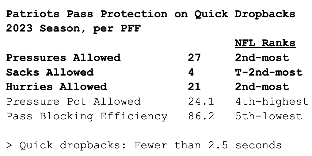 Their absences, and a lack of quality depth up front, have produced one of the league’s worst pass-blocking units. Despite Mac Jones averaging the 5th-fastest time to throw among quarterbacks with 100 attempts, New England is one of just five teams to allow a pressure rate over 40%. Even on quick dropbacks lasting fewer than 2.5 seconds, the Patriots have been losing at an alarming rate.