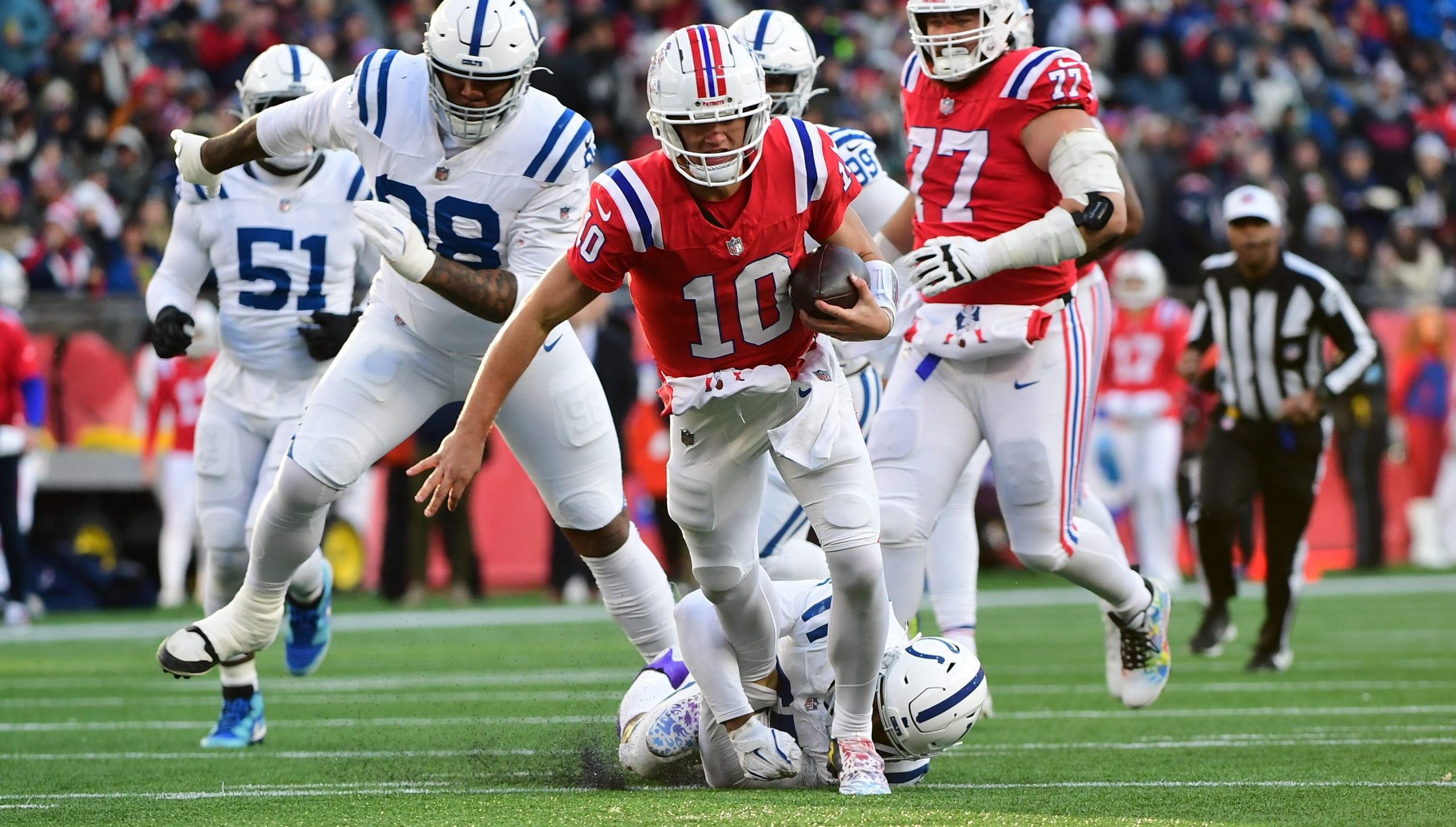 The Patriots hadn’t faced a true dual-threat quarterback until Anthony Richardson, and it was a rude awakening. The athletic marvel ran for fewer than 50 yards, but those included several key conversions, including two on scrambles.