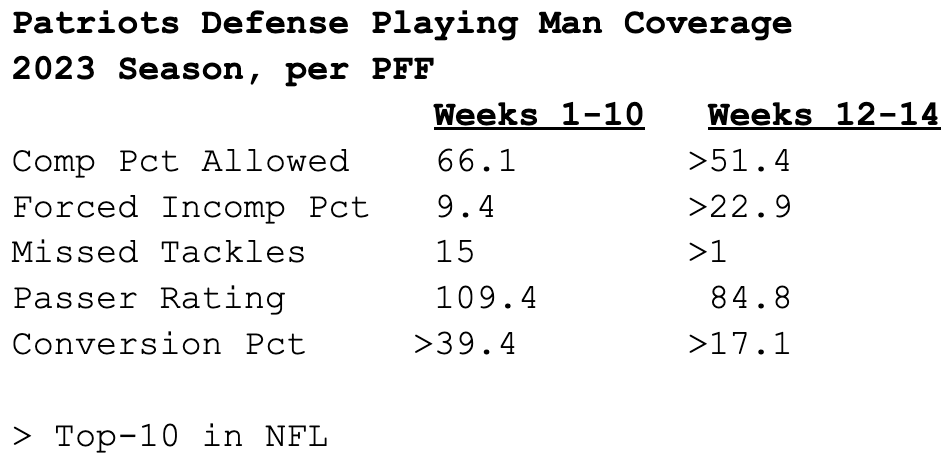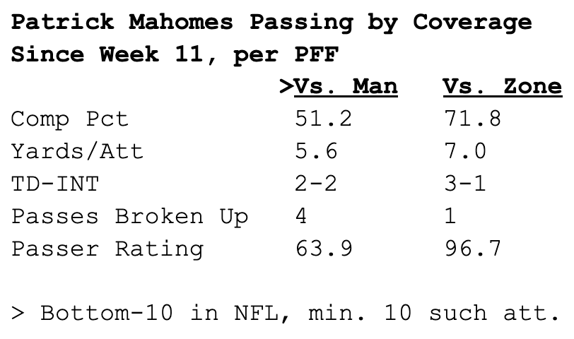Since the Chiefs exited their bye in Week 11, Mahomes ranks 3rd in the NFL with an 87.1 passing grade against man coverage. But according to raw stats, he’s been one of the league’s passers in such situations.