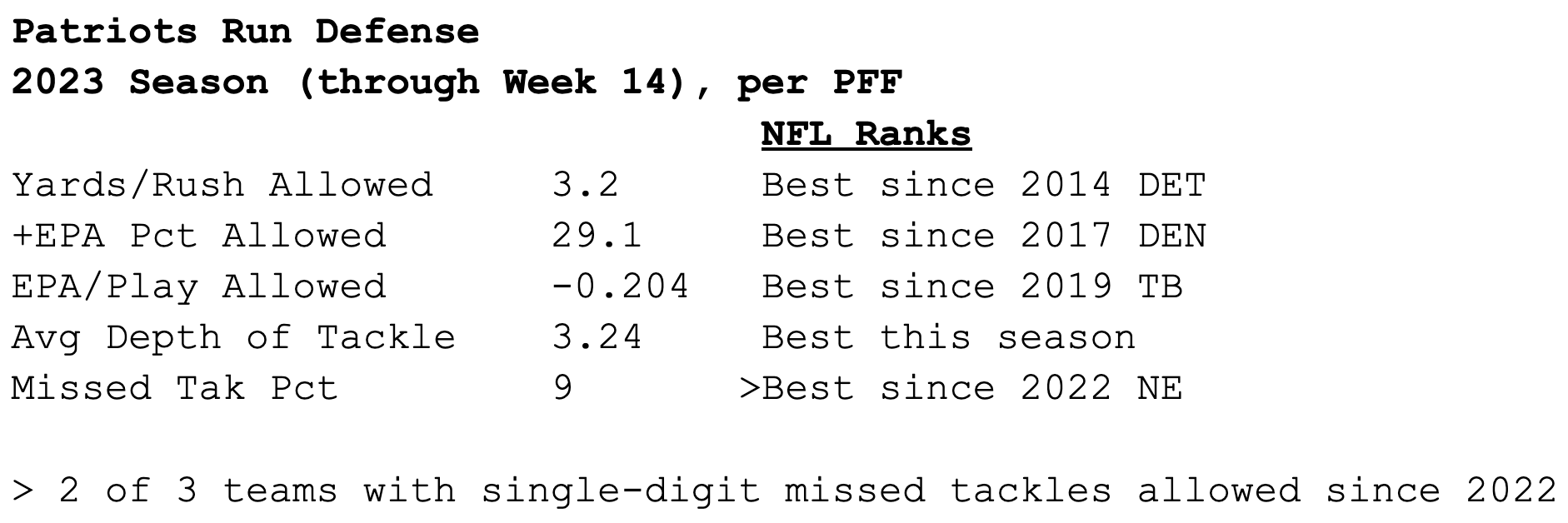 The defense will need another strong performance against a Chiefs offense that trails only the 49ers in rush EPA since Week 11. Top rusher Isiah Pacheco missed last week’s game and Wednesday’s practice with a shoulder injury, putting his status this weekend in question. But he can’t be overlooked after being tied for 5th in explosive runs (6) and rushing touchdowns (3) from Weeks 11-13.