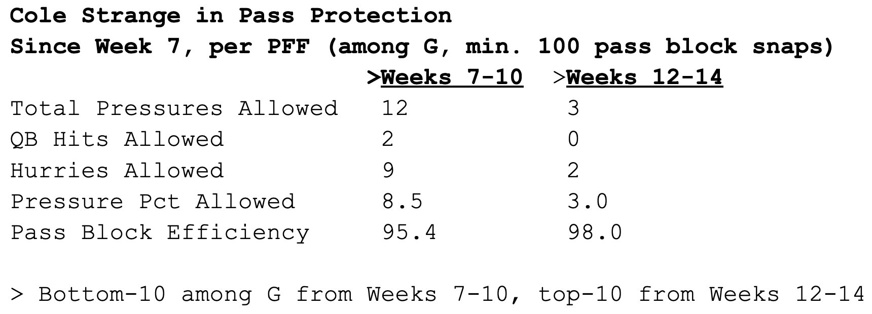 The Patriots’ pass protection put on a show early last week, keeping a disruptive Steelers front remarkably quiet for most of the 1st half. It was the latest in a string of impressive performances from Cole Strange since the bye, who battled injury and inconsistency since returning full-time in Week 7.