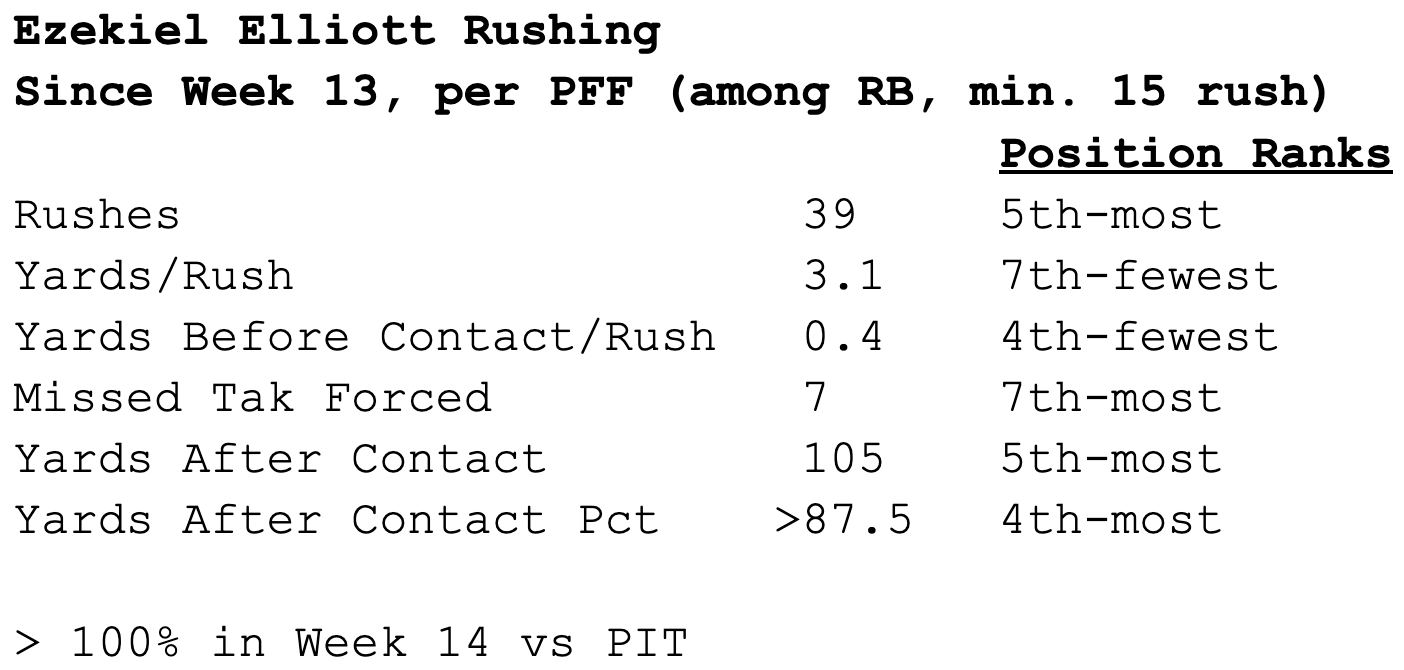Ezekiel Elliott had to make a defender miss at or behind the line of scrimmage on most carries, which seems to be a trend over the past two games.