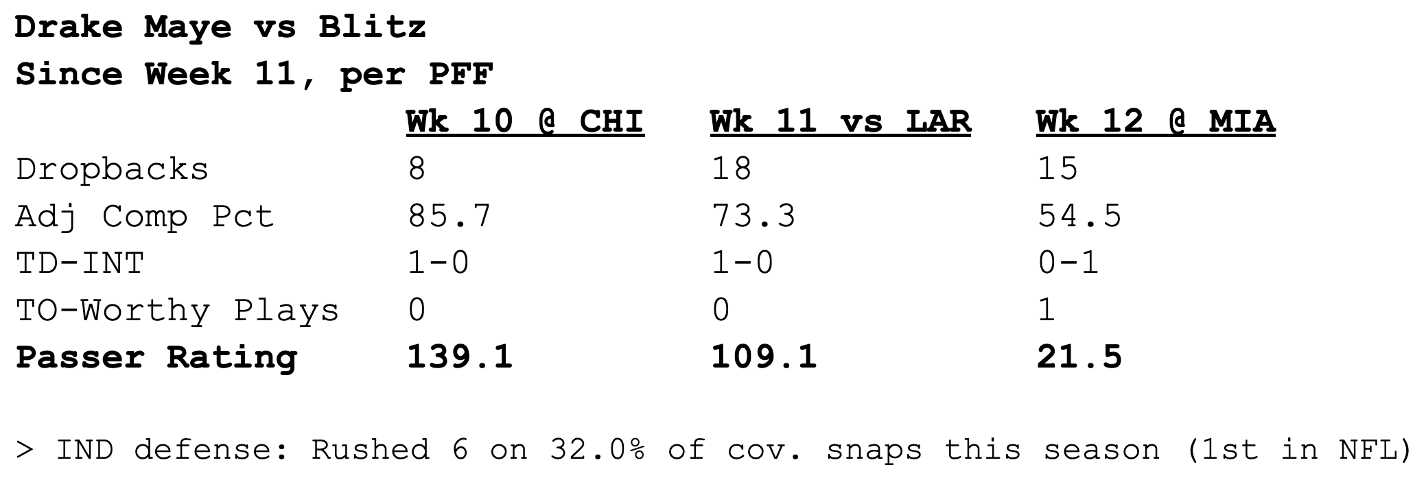 Drake Maye was excellent against the blitz in his first few starts, carving up the Bears and Rams when they sent second/third-level rushers. But last week, constant self-inflicted errors had the Patriots sweating in Miami.