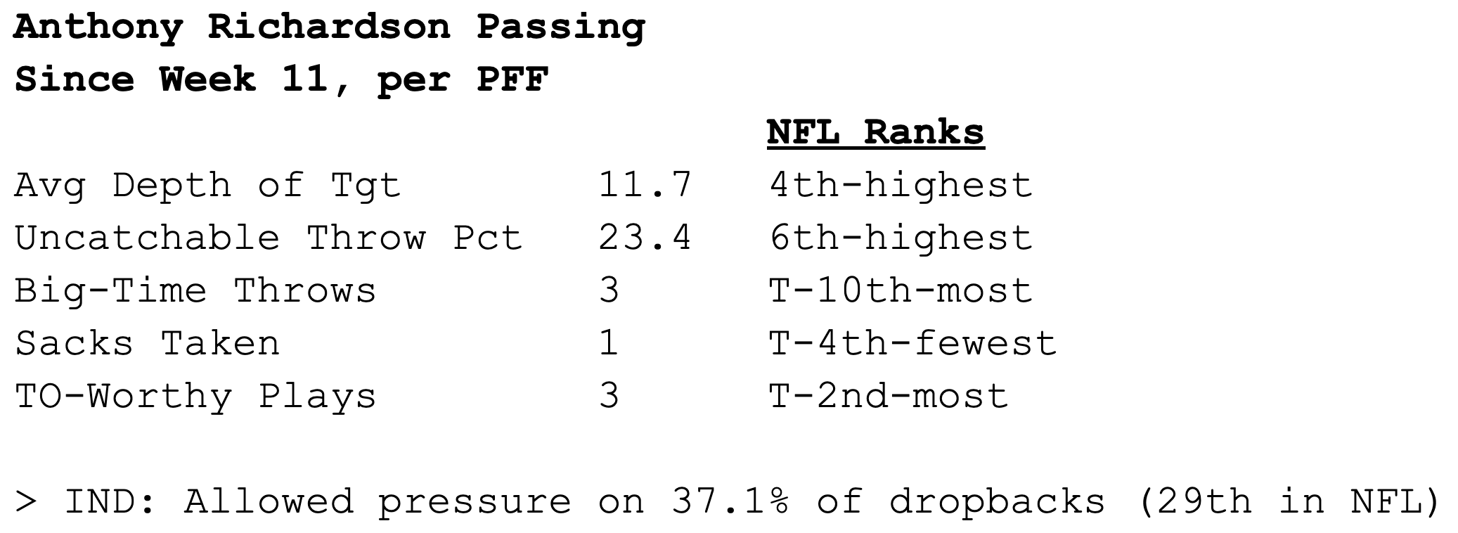 Richardson is still adjusting to the pro game and learning to tame his big arm. He’s prone to wild misses, which, along with inconsistent vision, can lead to interception opportunities. He’s also been strip-sacked in each of the past two weeks.