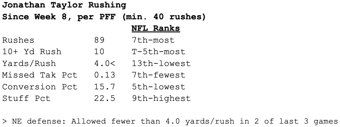 Jonathan Taylor’s numbers are down due to poor blocking and a high-ankle sprain, but he’s still a big-play threat whenever he touches the rock.