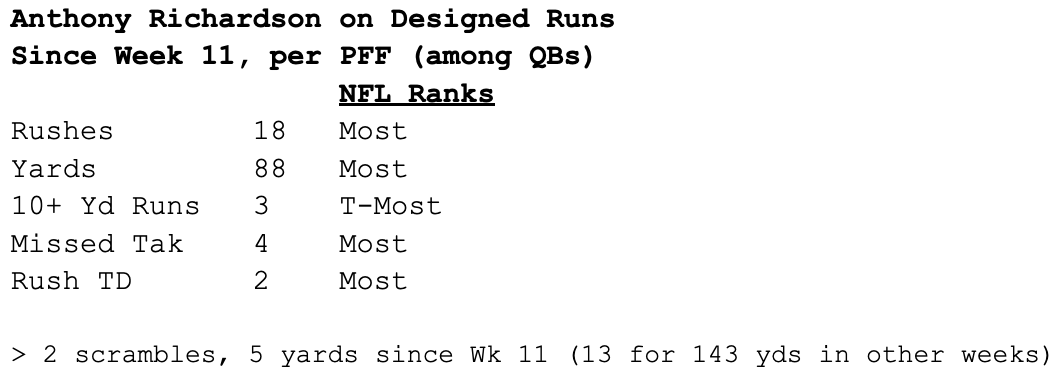 Richardson can extend plays or take off when necessary as a passer, but that’s not the only place his athleticism shines. Most of his carries have actually come on designed runs, where Richardson’s been the most productive runner at his position since Week 11.