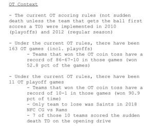 The game is NOT decided by a coin toss, it’s decided by the players on the field. In an NFL game, specifically the playoffs, you should be able to trust your defense to get you ONE stop. After that, the odds are in your favor! Your offense only needs a field goal to win the game. That sounds pretty fair to me.
